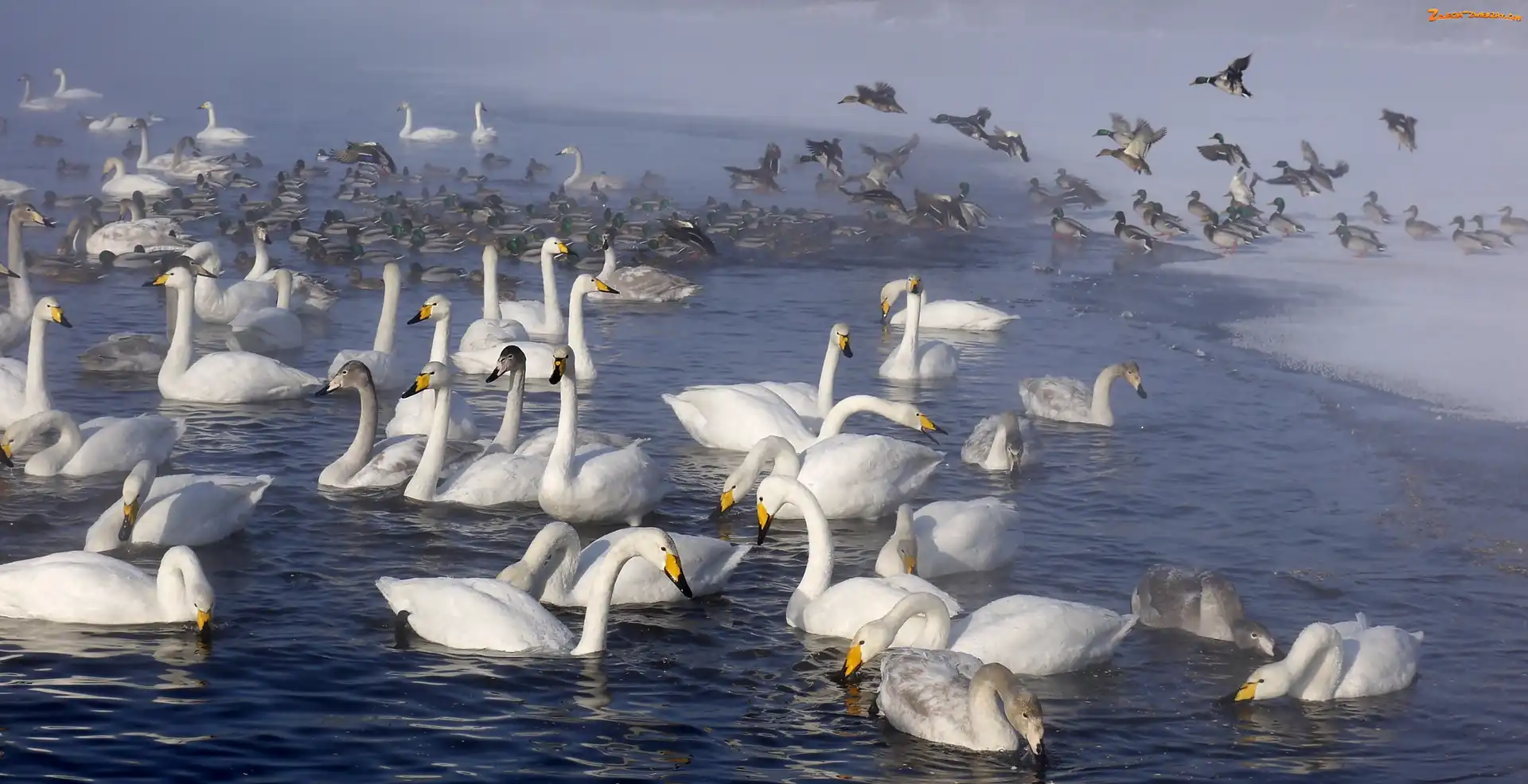 Łabędzie, Mgła, Jezioro, Kaczki