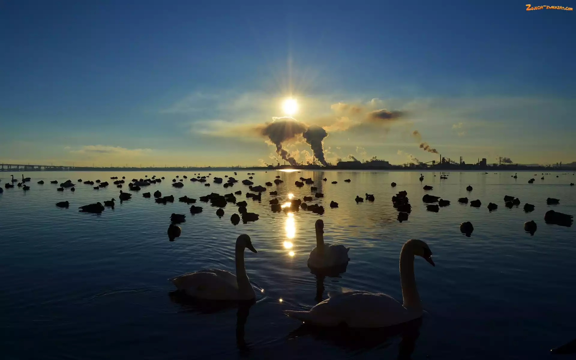 Zdjęcie: Słońce, Jezioro, Łabędzie