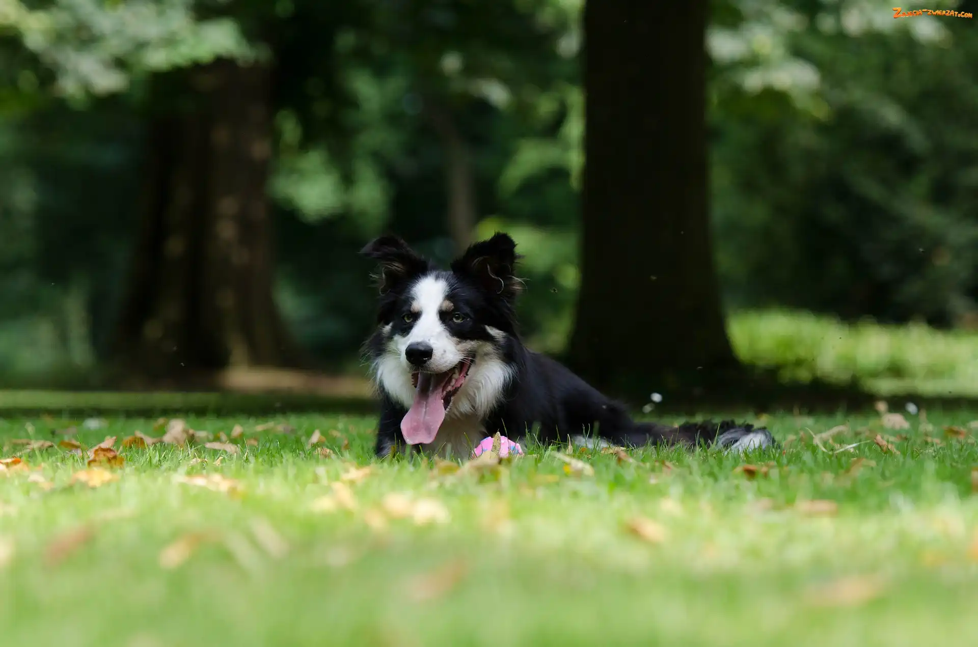 Zdjęcie: Jęzor, Border collie, Liście, Łąka, Leżący