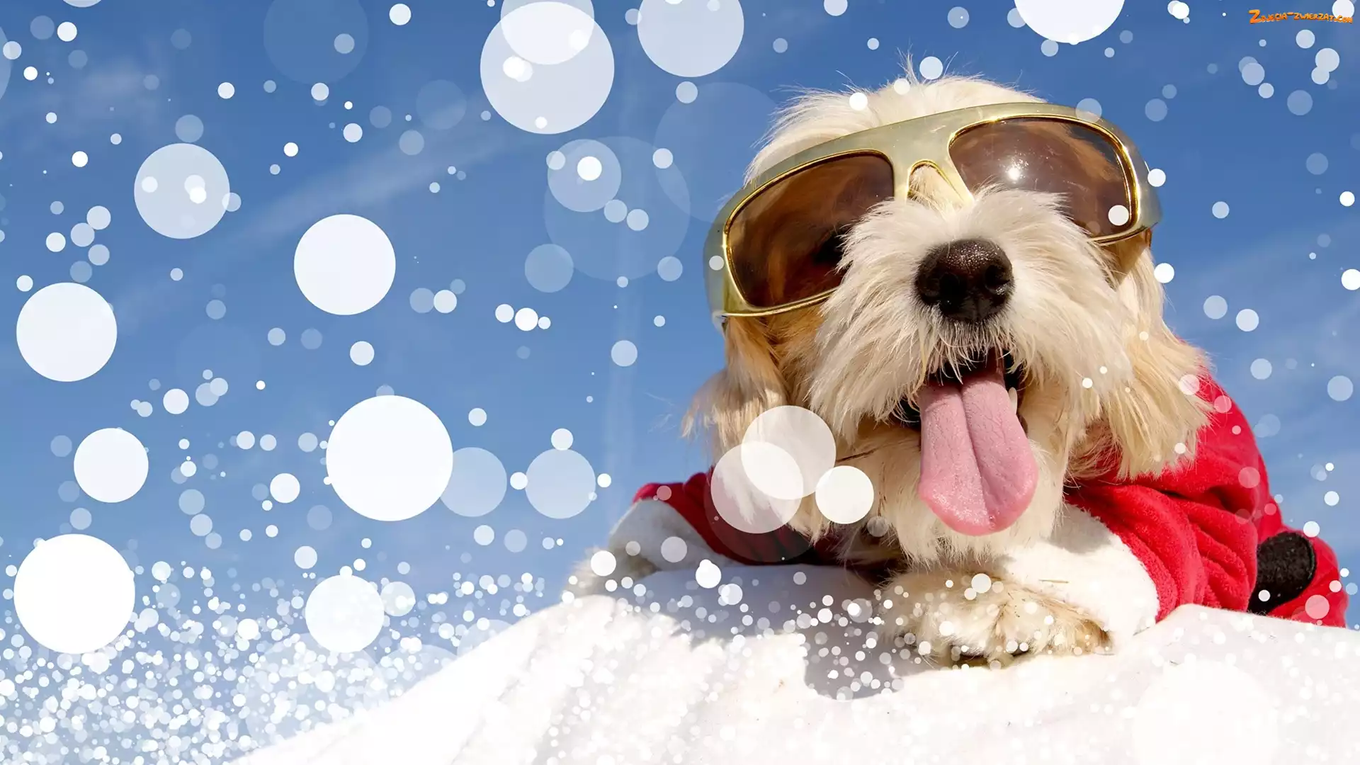 Zdjęcie: Jęzor, Strój Mikołaja, Śnieg, Pies, Okulary