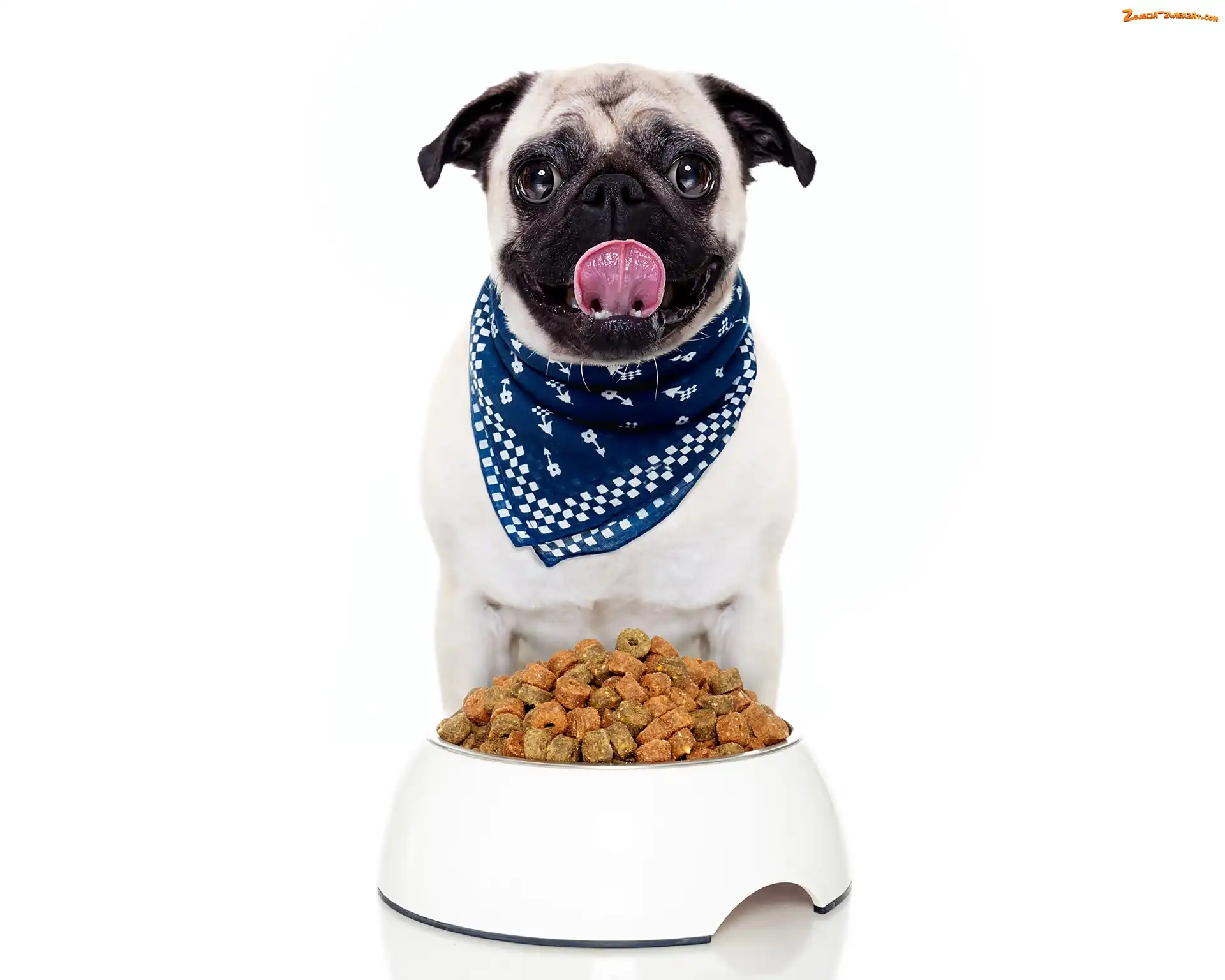 Zdjęcie: Śmieszne, Karma, Pies, Chusta, Bandamka, Miska, Mops, Język