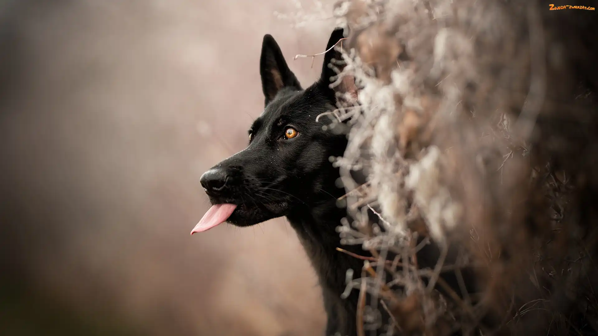 Zdjęcie: Tło, Mordka, Pies, Rośliny , Rozmyte, Czarny owczarek niemiecki, Język