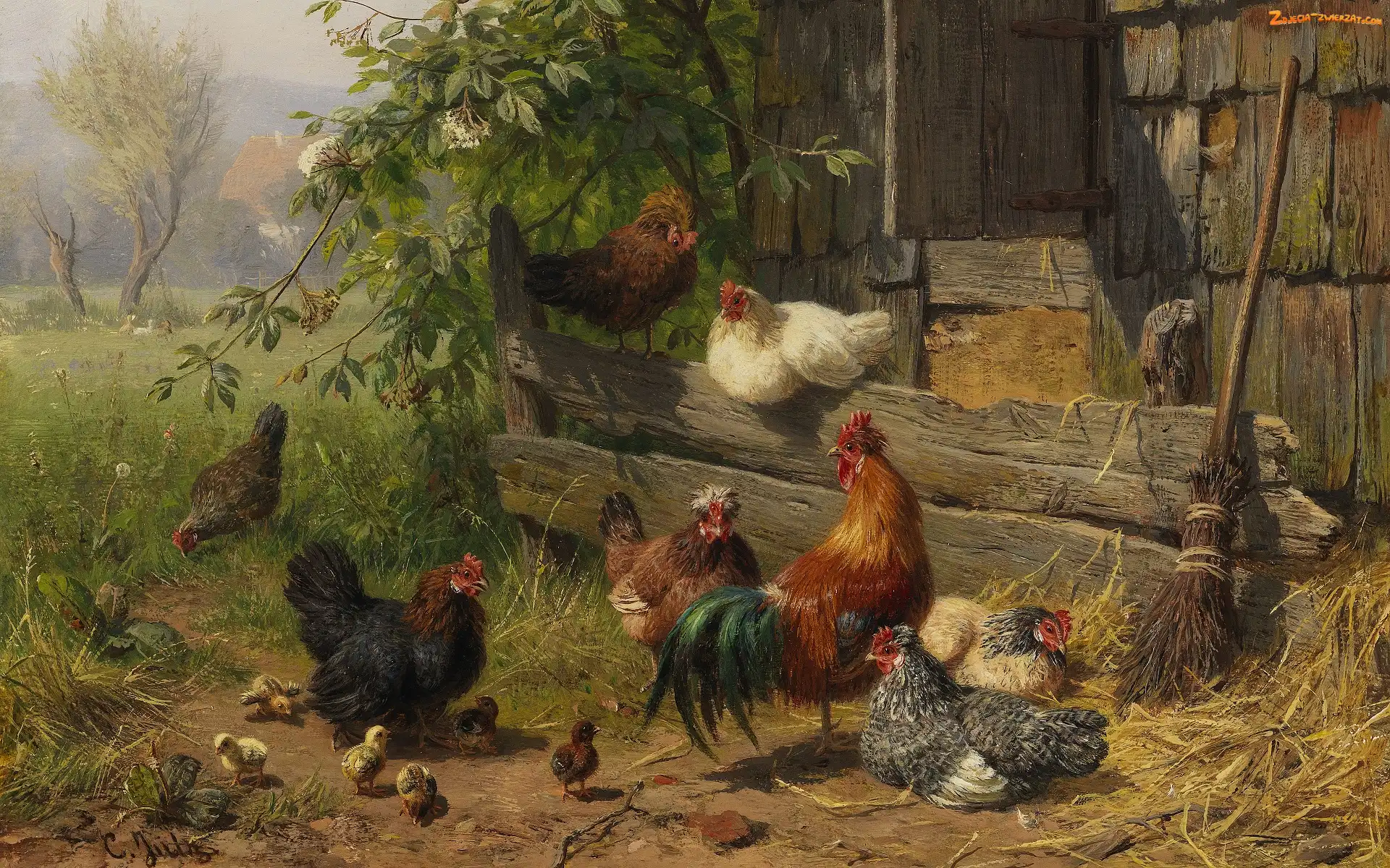 Zdjęcie: Domowe, Carl Jutz, Kury, Kurczaki, Malarstwo, Obraz, Kogut, Zagroda, Wiejska, Ptactwo