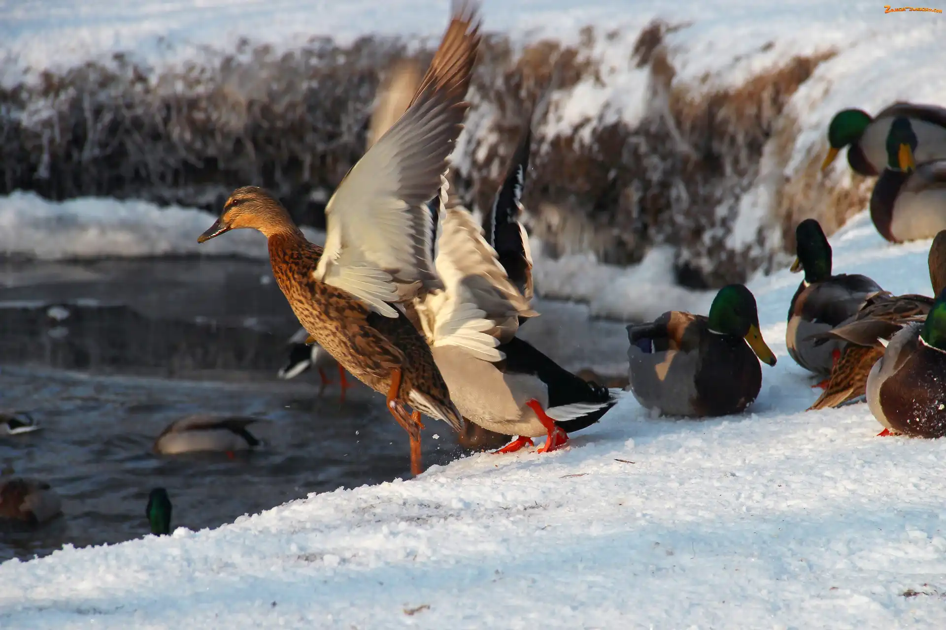 Zdjęcie: Kaczki, Śnieg, Dzikie, Staw