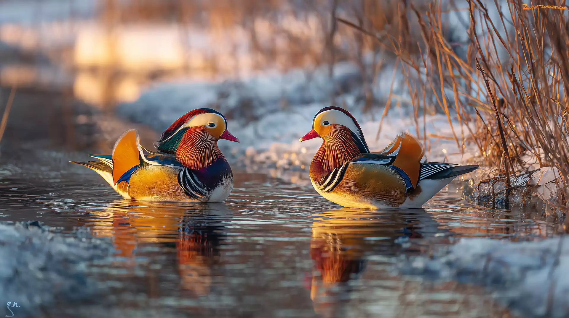 Zdjęcie: Grafika ai, Staw, Kaczki, Mandarynki, Zima, Zarośla