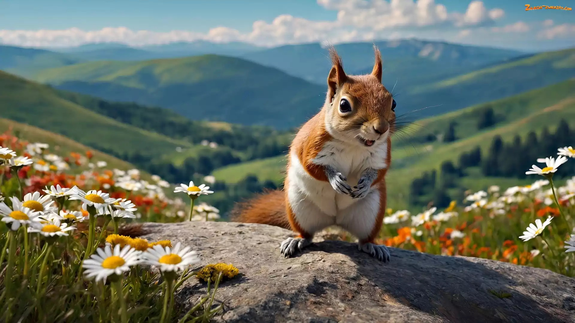 Zdjęcie: Góry, Głaz, Wiewiórka, Kamień, Kwiaty, Stokrotki