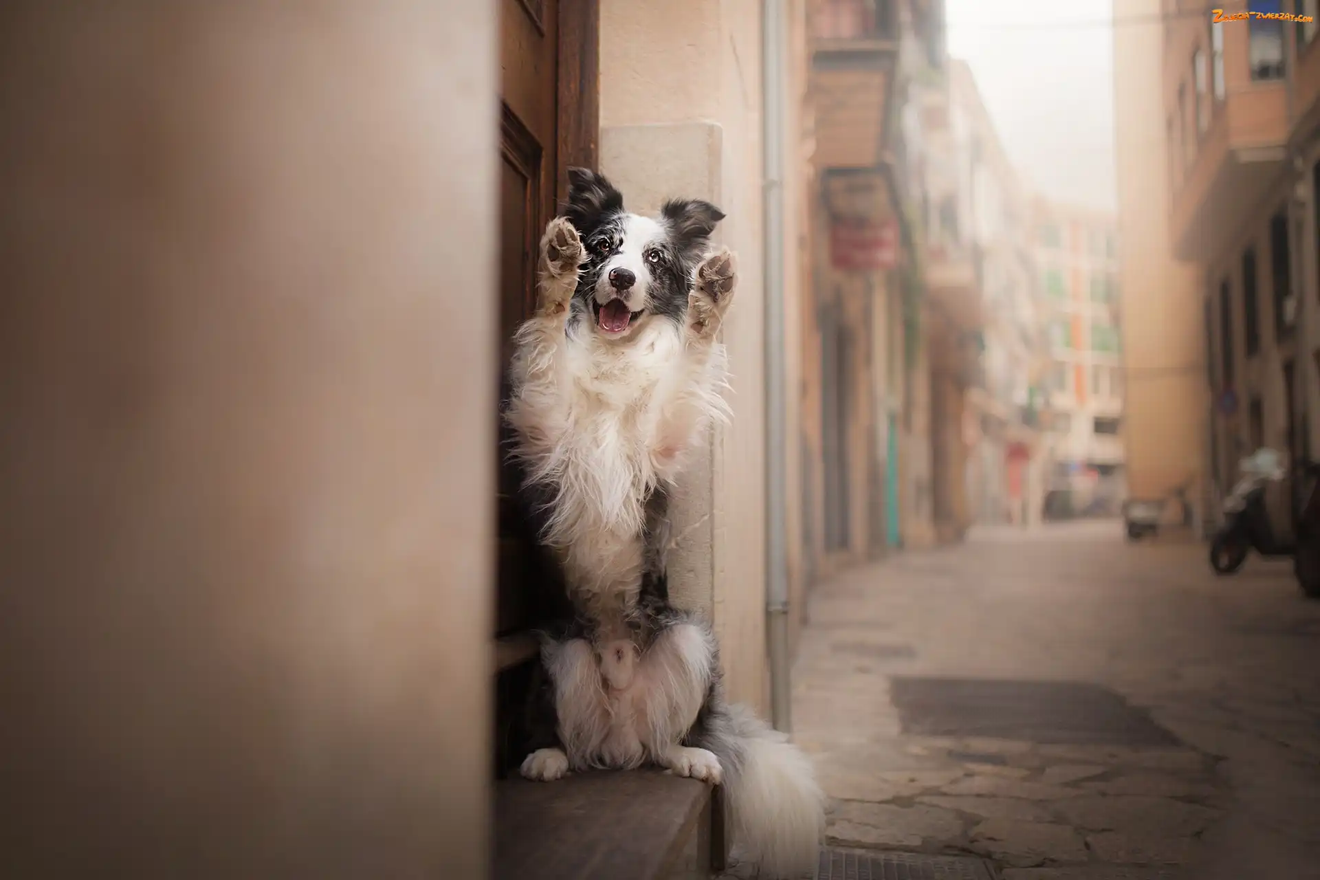Zdjęcie: Kamienice, Uliczka, Border collie, Pies, Postawa