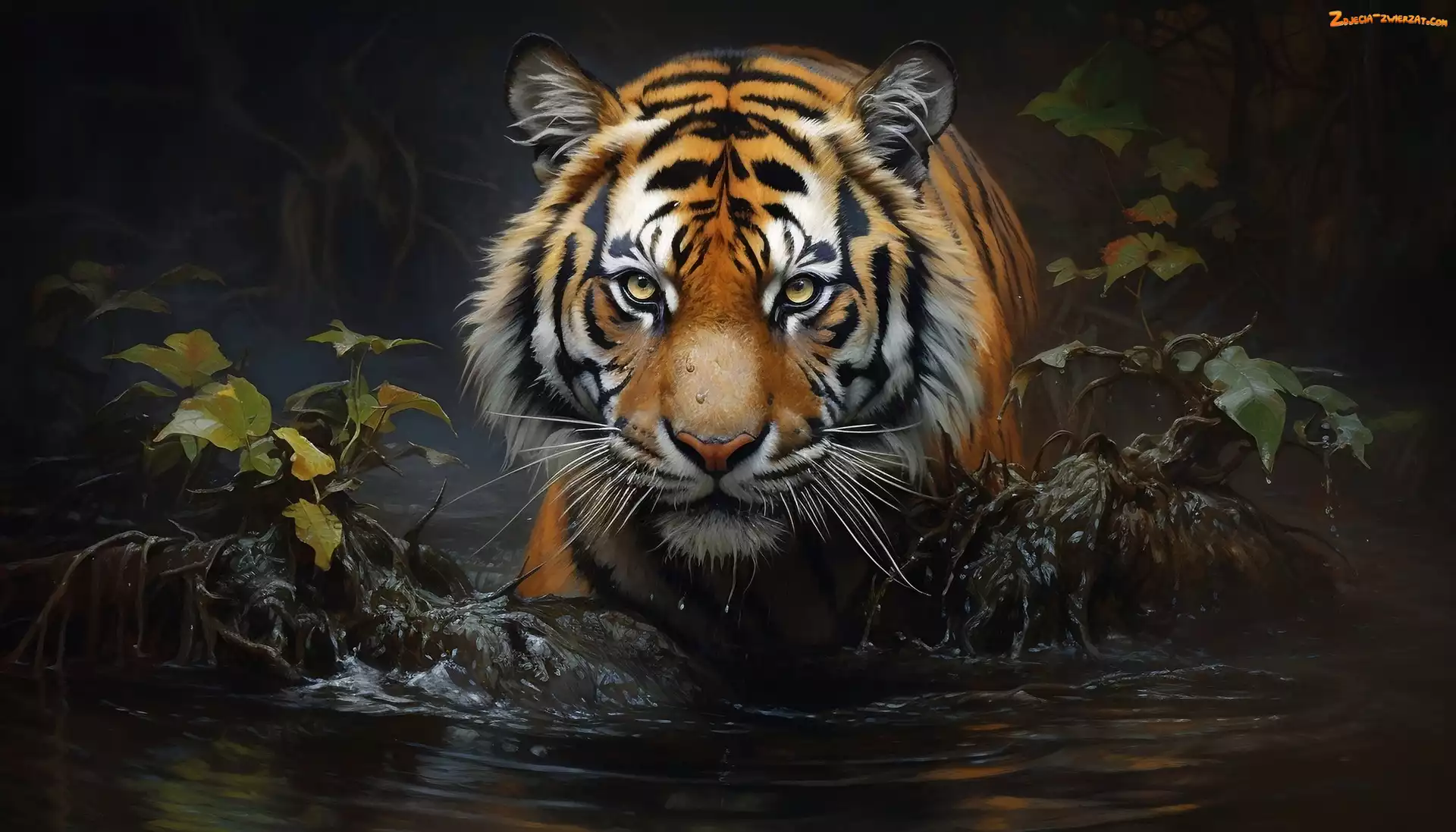 Zdjęcie: Woda, Kamienie, Grafika, Tygrys, Rośliny