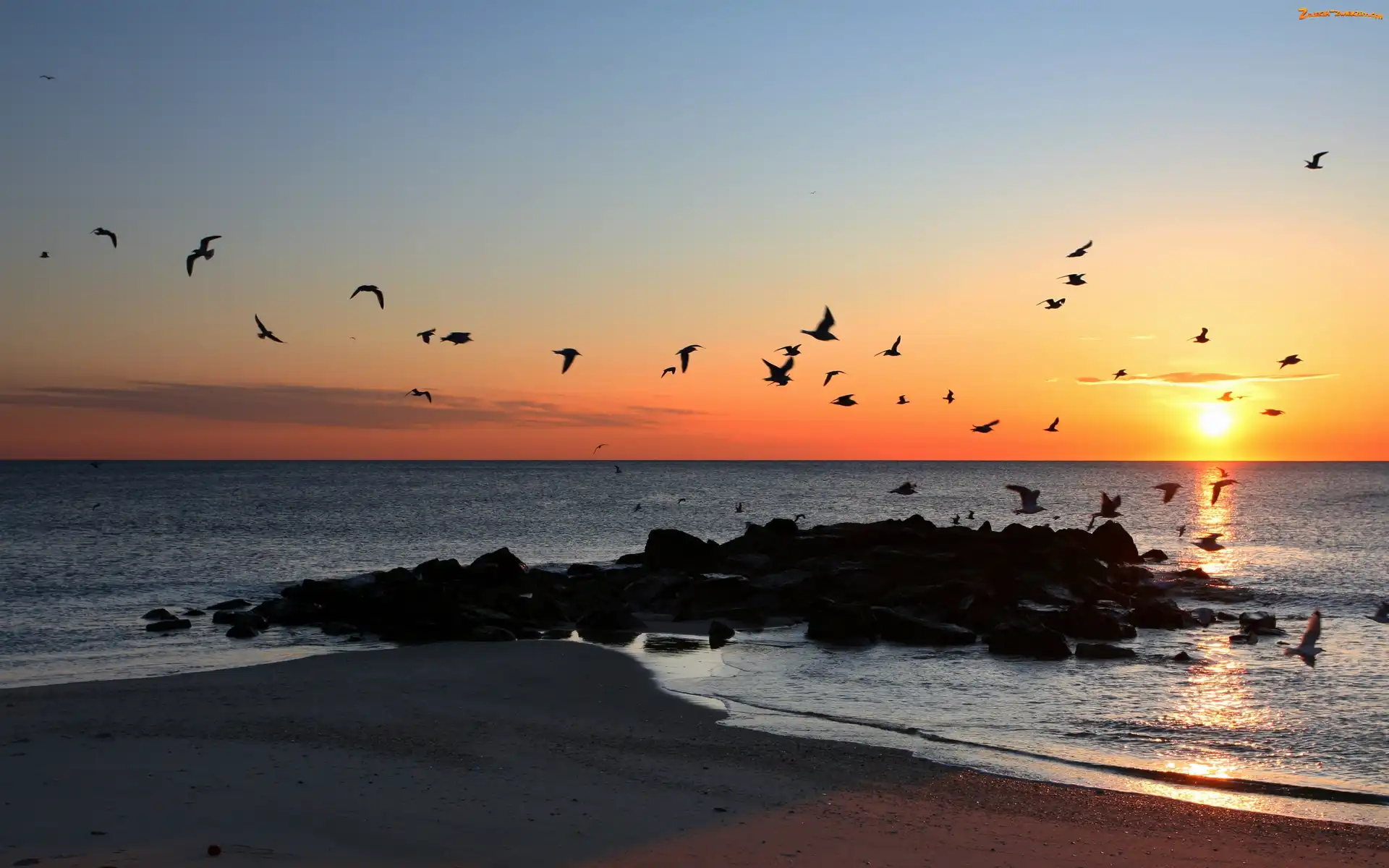 Zdjęcie: Kamienie, Plaża, Słońca, Wschód, Morze, Ptaki