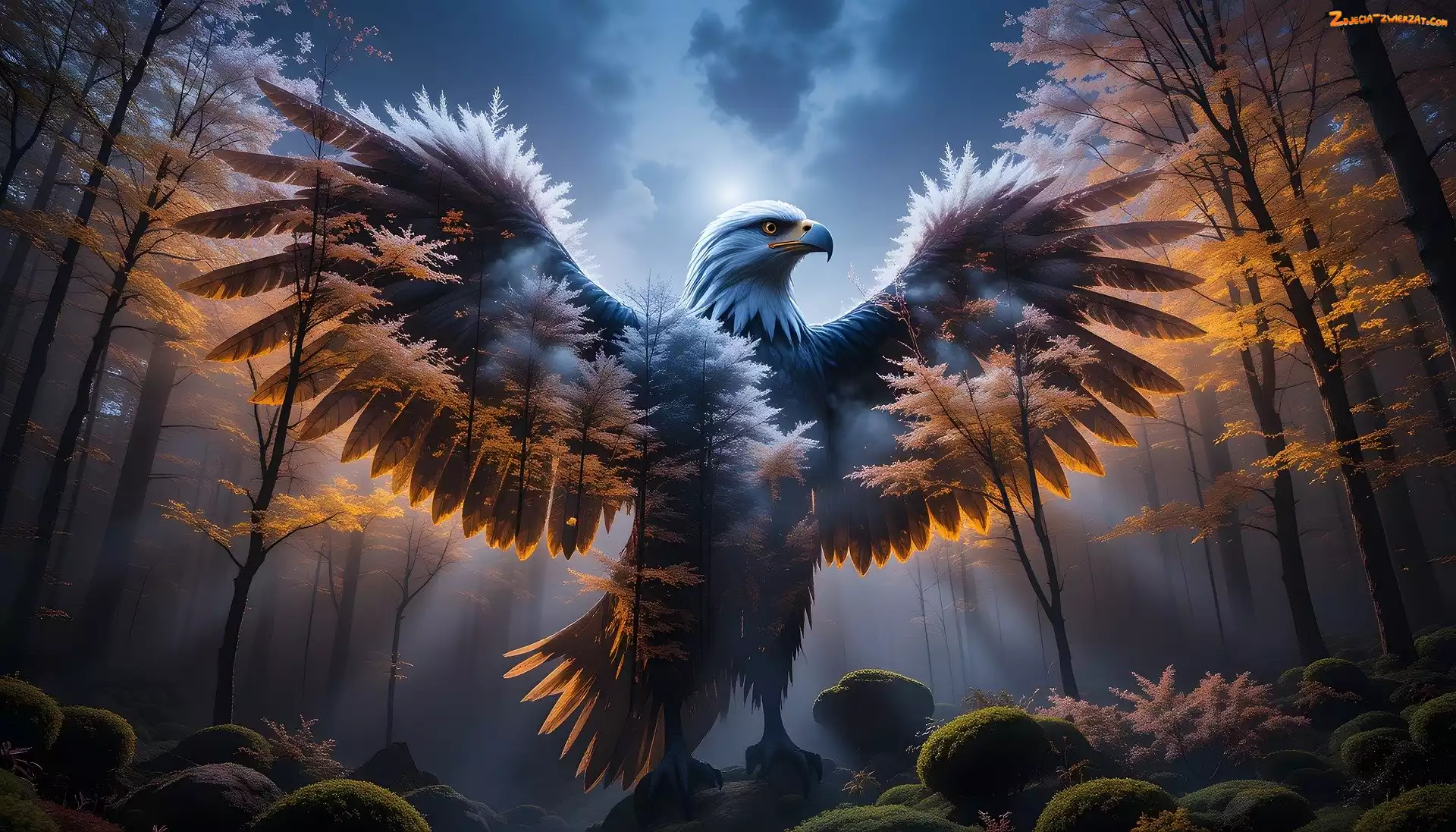 Zdjęcie: Skrzydła, Światło, Ptak, Zielony, Komputerowa, Kamienie, Mech, Przyroda, Mgła, Natura, Drzewa, Podświetlenie, Orzeł, Krajobraz, Pióra, Drapieżny, Grafika, Liście |