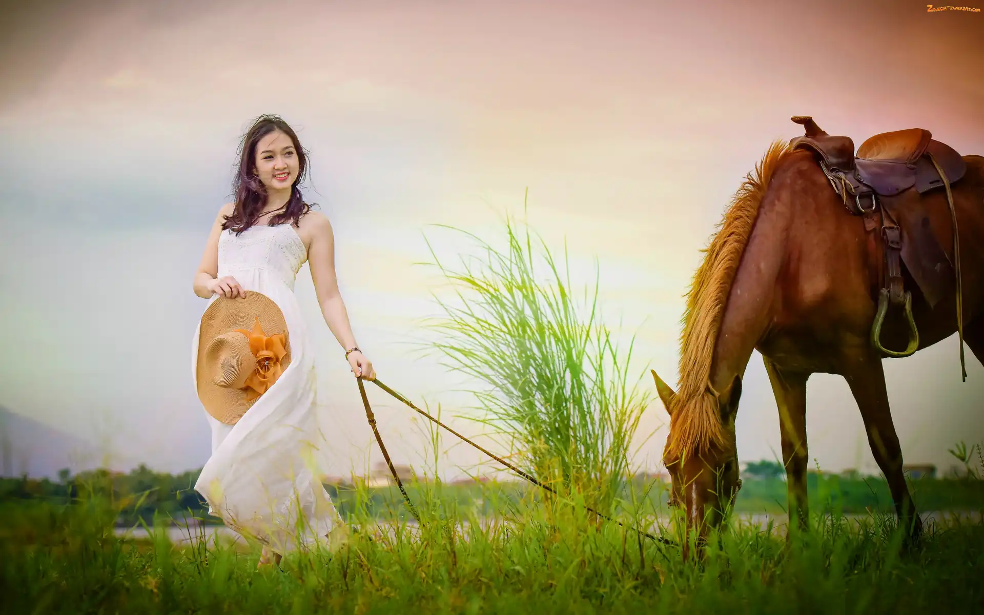 Zdjęcie: Kapelusz, Modelka, Staw, Łąka, Azjatka, Koń