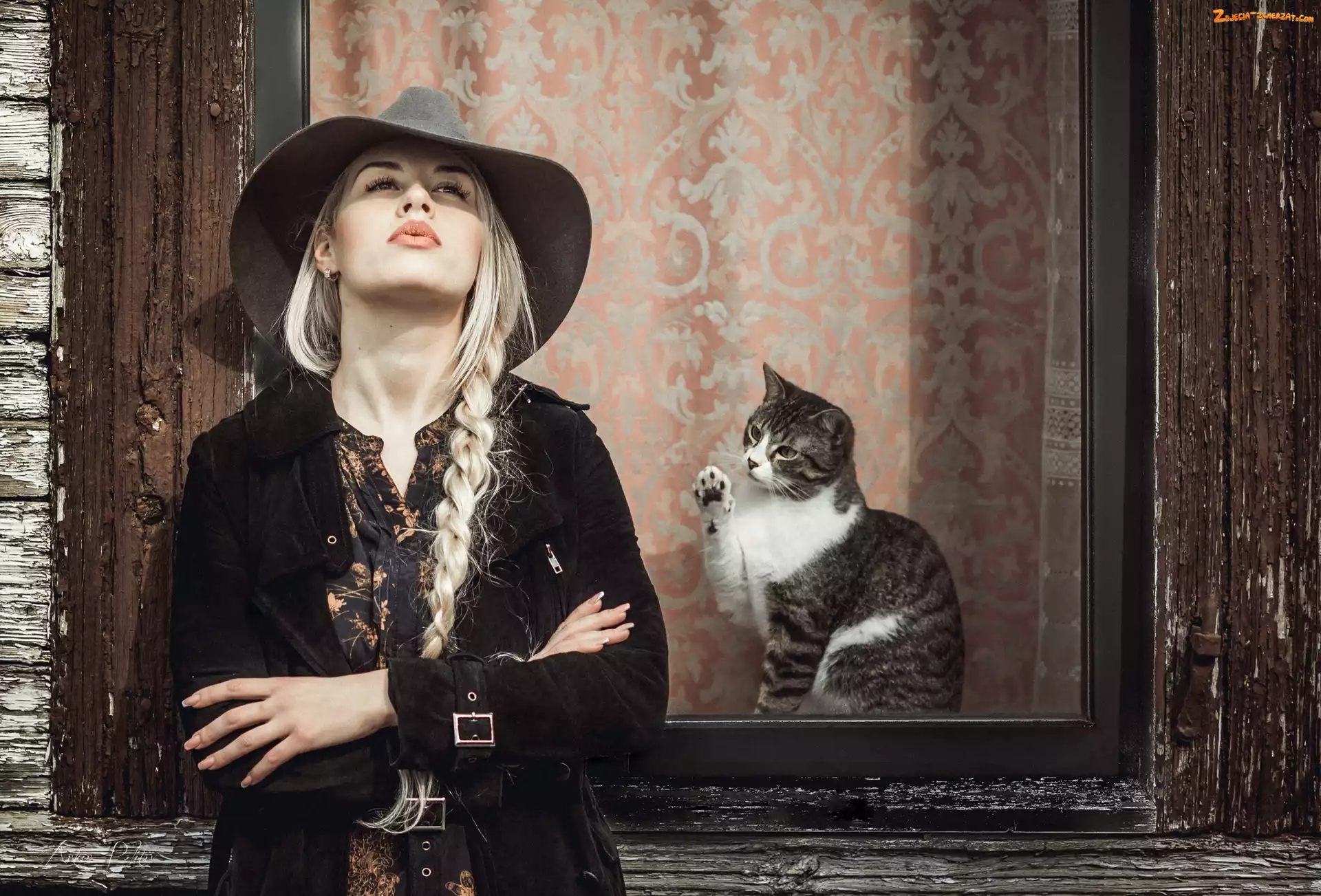 Zdjęcie: Kapelusz, Kot, Dziewczyna, Okno