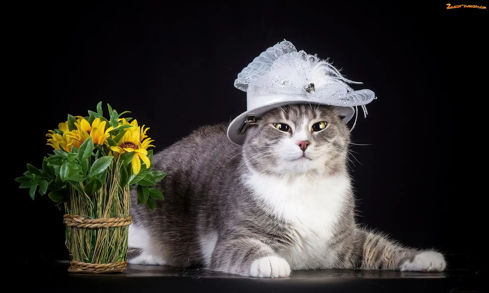 Zdjęcie: Kapelusz, Kwiaty, Kot, Żółte