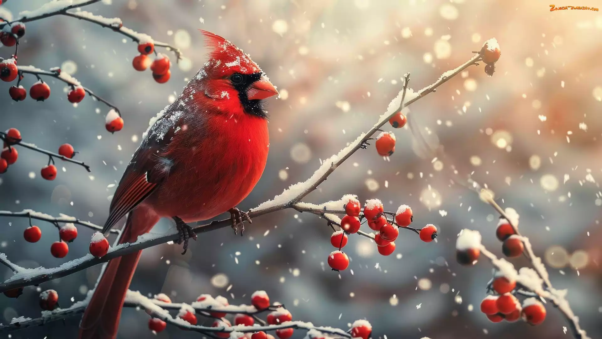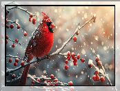 Zdjęcie: Owoce, Ośnieżone, Ptak, Kardynał szkarłatny, Gałązki, Czerwone