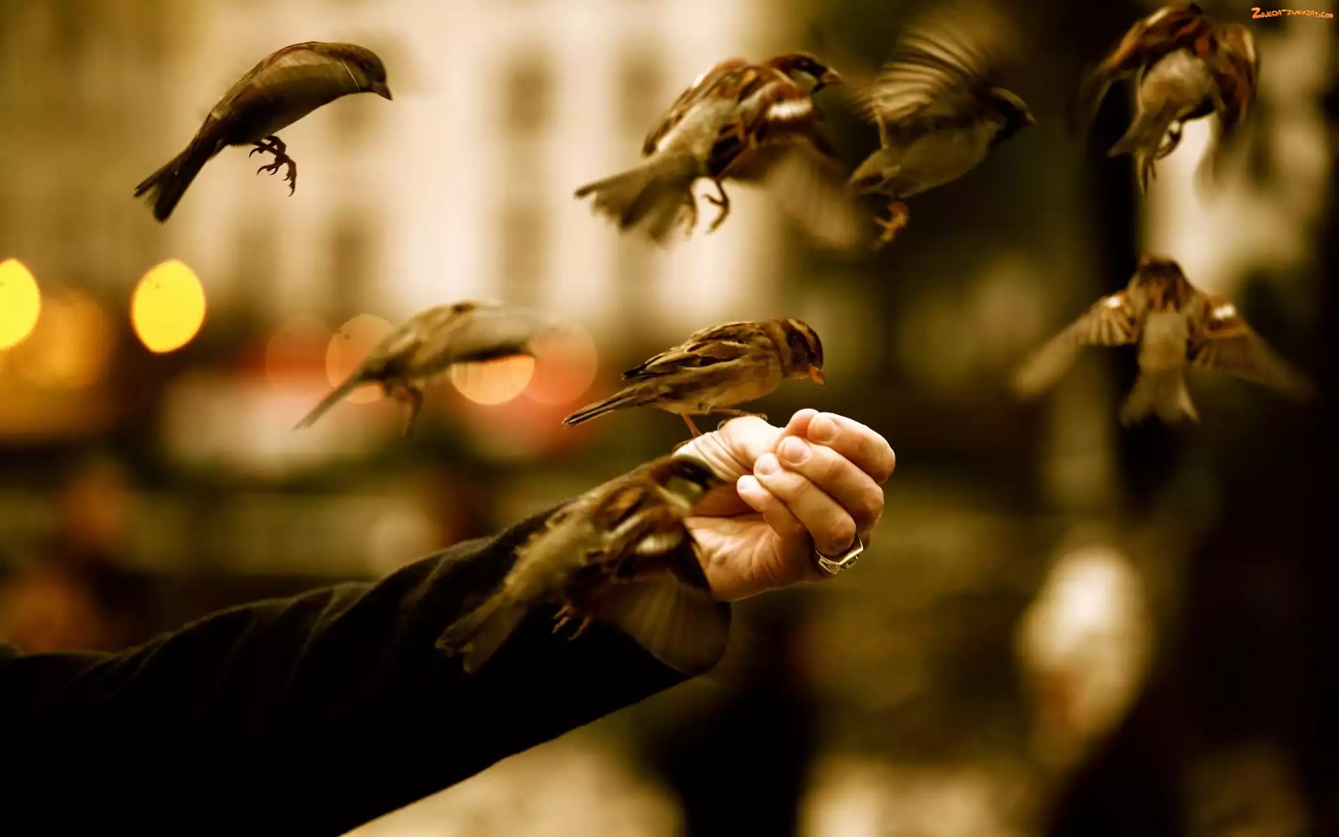 Zdjęcie: Karmienie, Dłoń, Wróble, Ptaki, Ręka