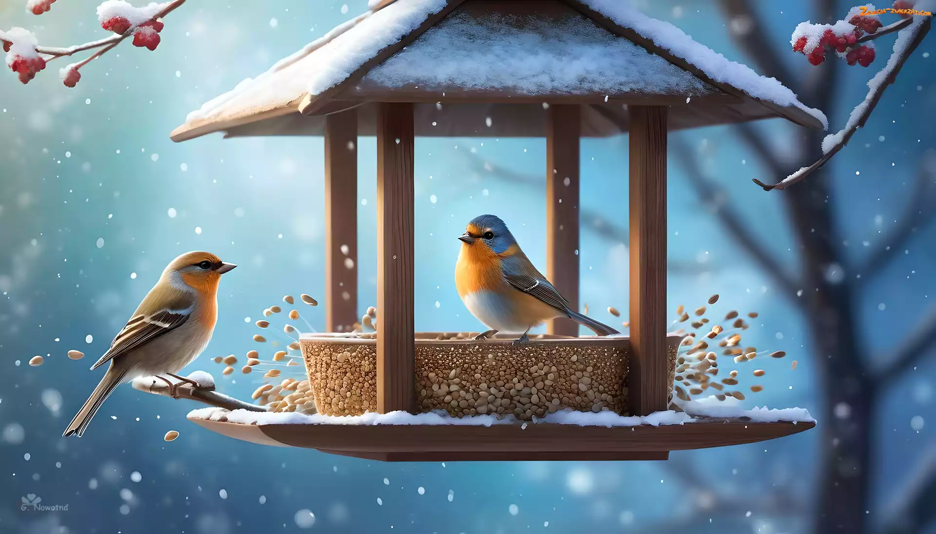 Zima, Karmnik, Grafika, Kolorowe, Ptaki