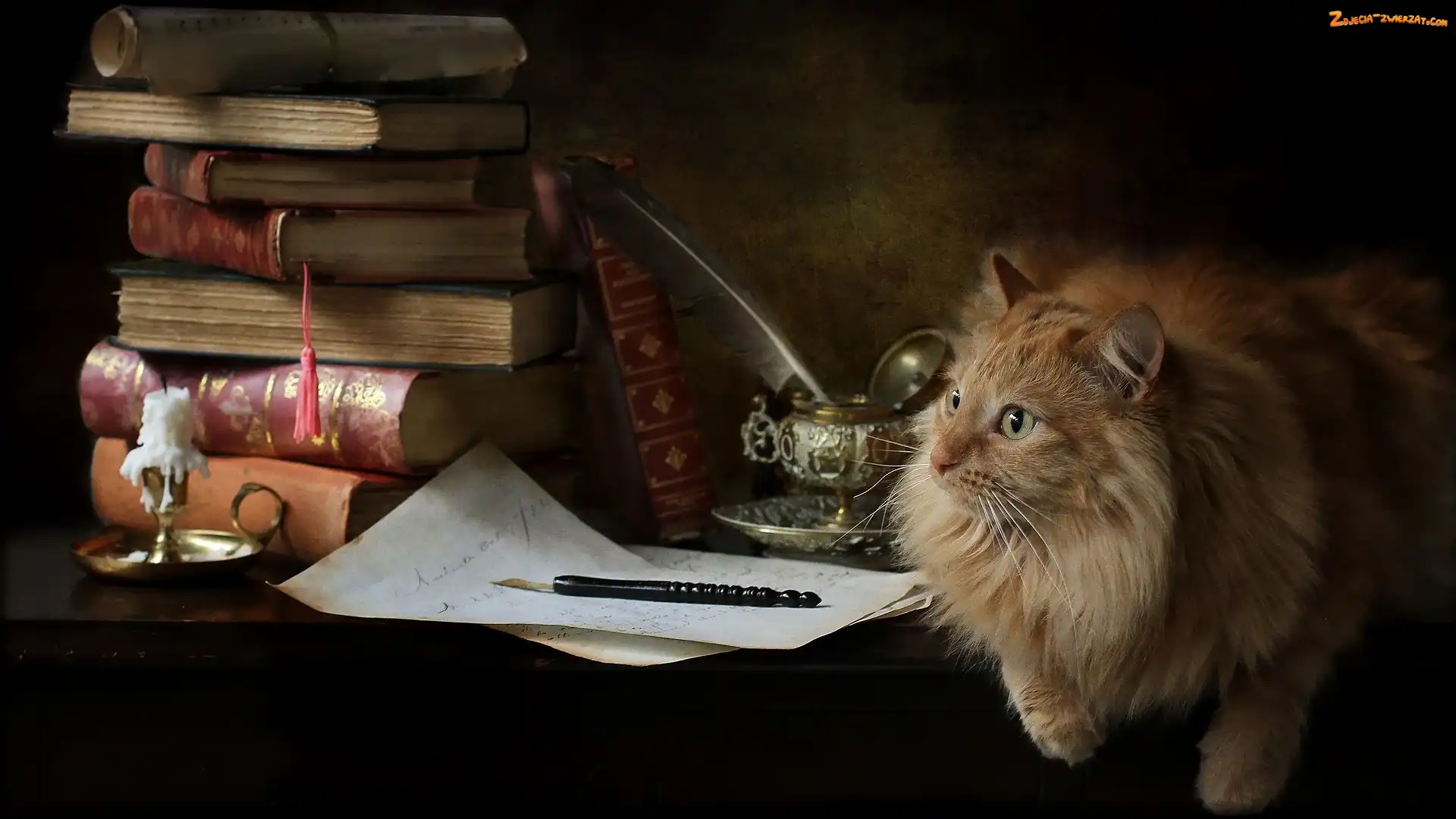 Książki, Świeczka, List, Kompozycja, Kałamarz, Pióro, Kot, Rudy, Kartka