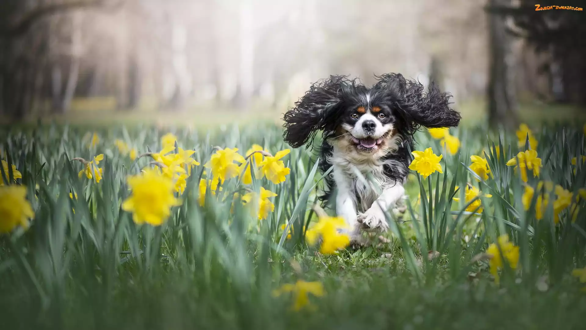 Cavalier king charles spaniel, Narcyzy żonkile, Pies, Kwiaty