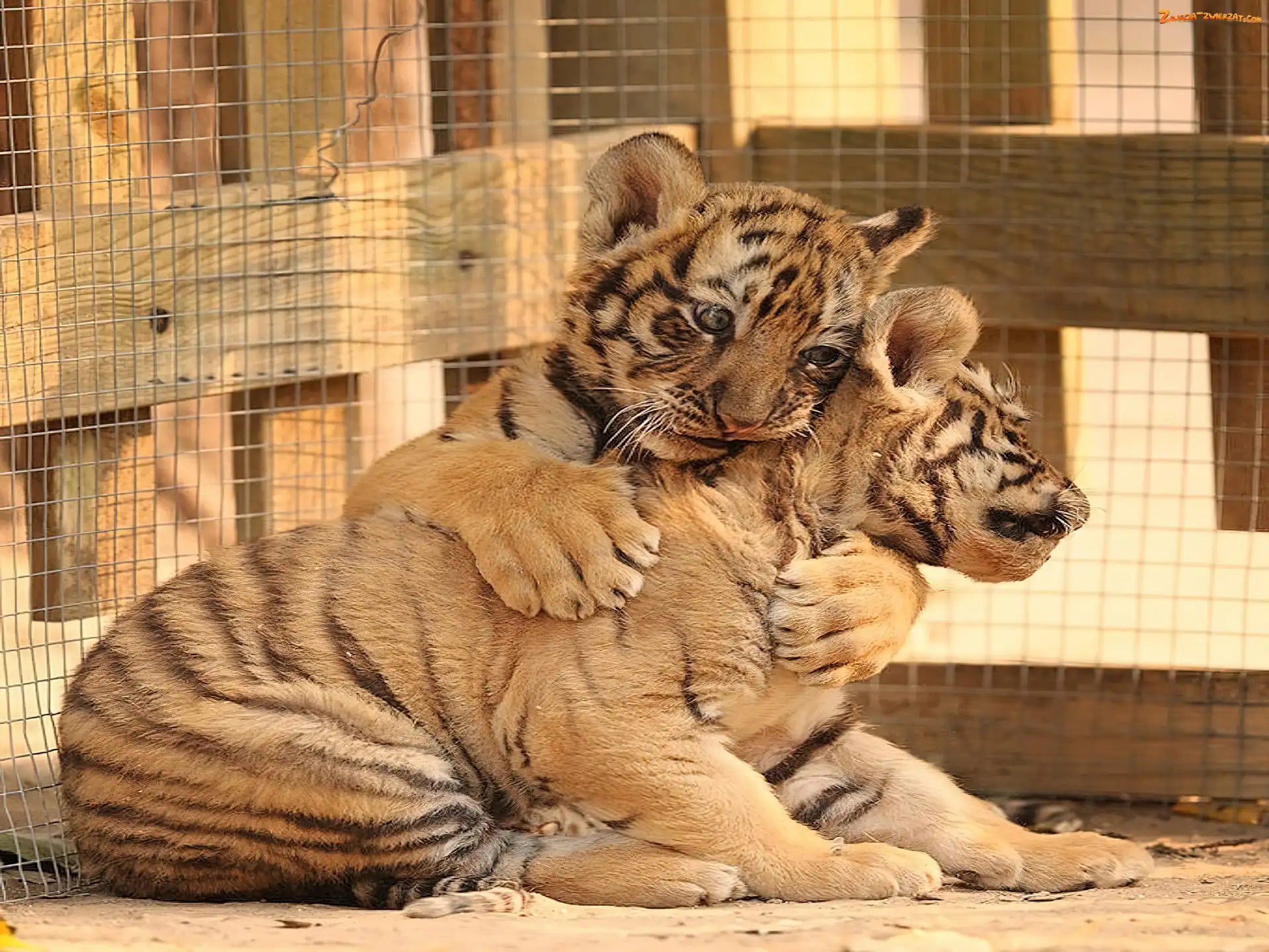 Zdjęcie: Klatka, Tygryski, Małe, Dwa, Przytulone