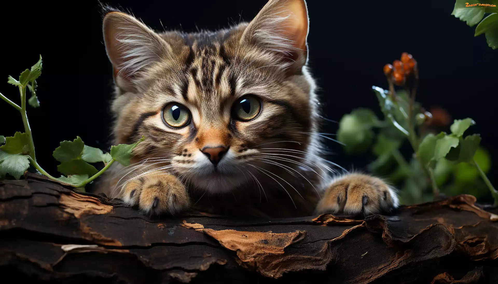 Zdjęcie: Kot, Pyszczek, Rośliny, Kłoda