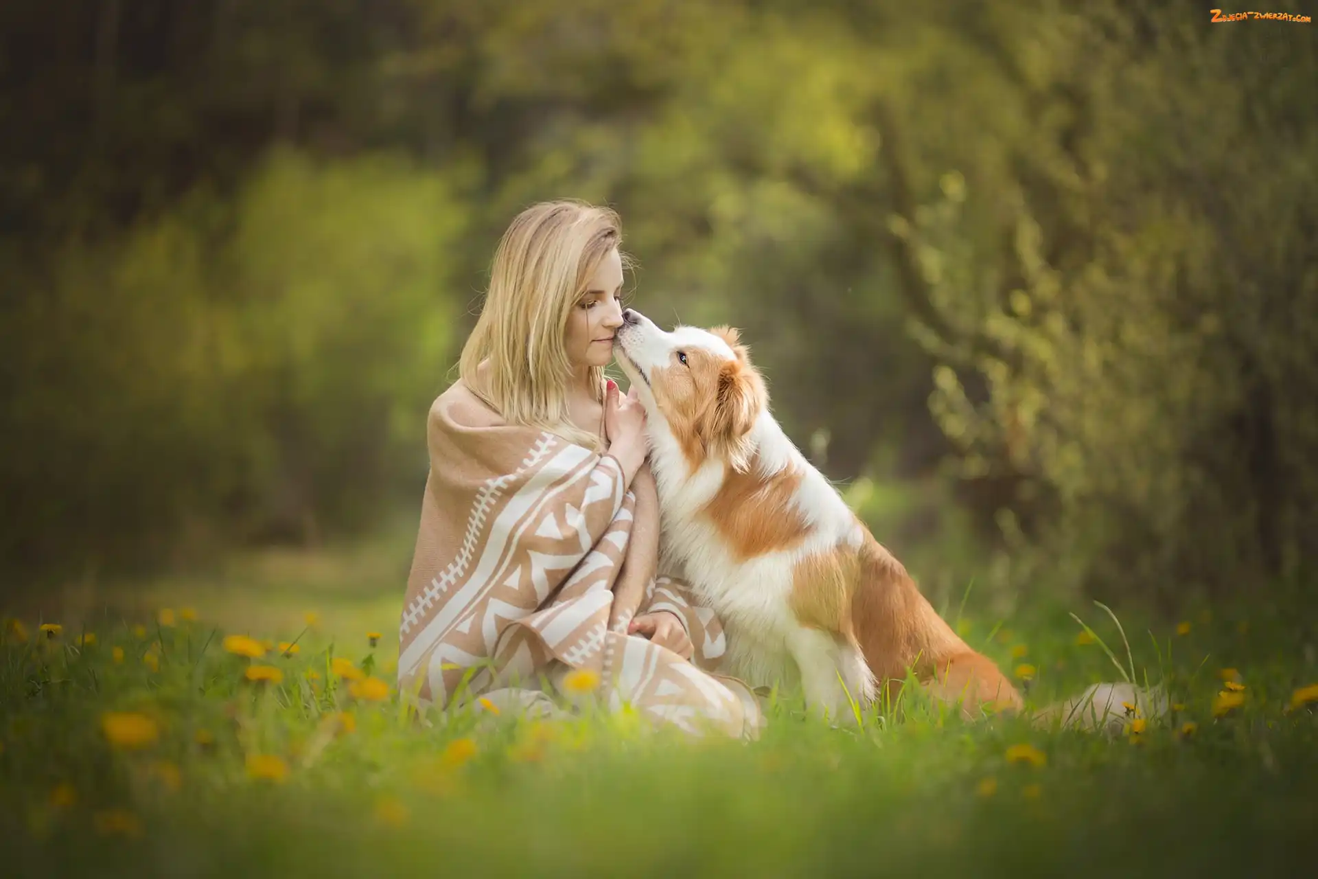 Zdjęcie: Pies, Kobieta, Rozmyte tło, Łąka, Koc, Border collie
