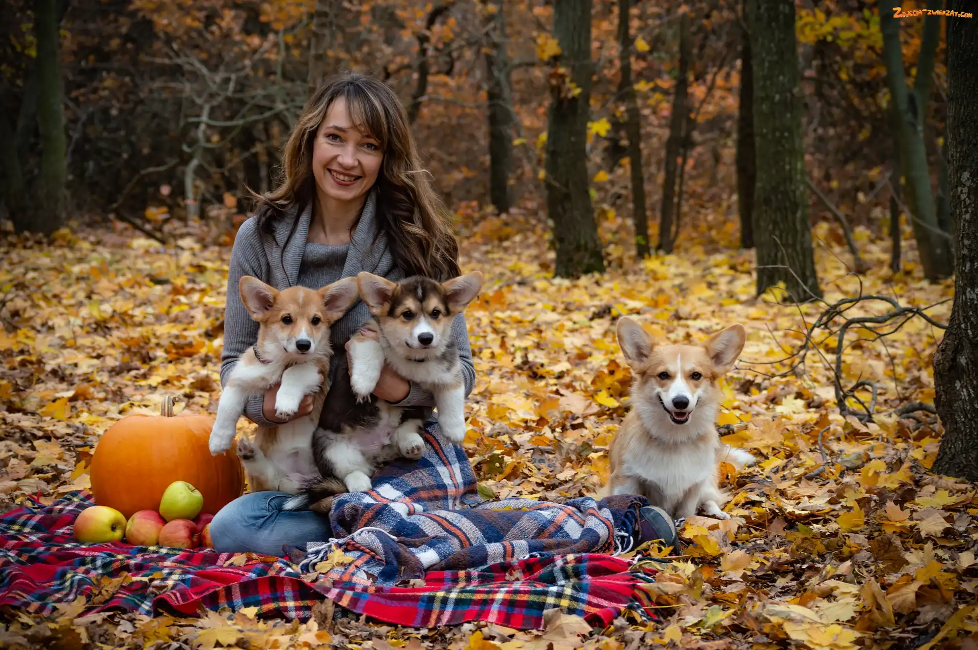 Zdjęcie: Liście, Welsh corgi pembroke, Trzy, Koc, Dynia, Psy, Kobieta