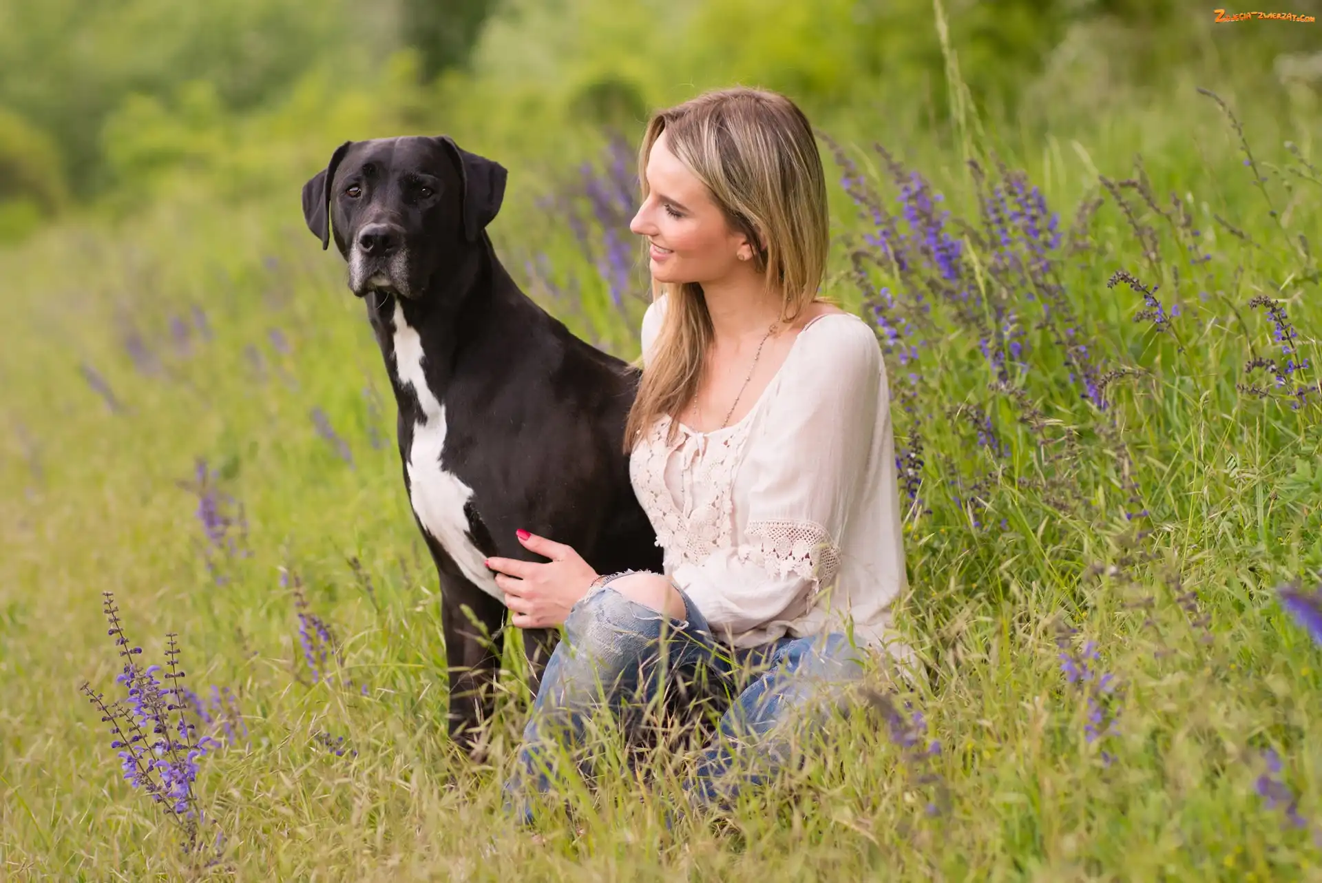 Zdjęcie: Kobieta, Kwiaty, Pies, Łąka