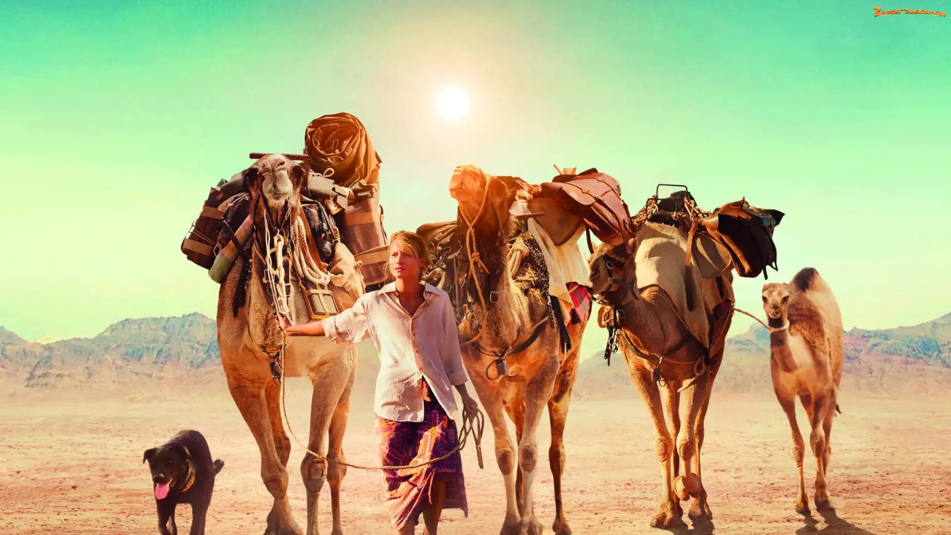 Zdjęcie: Kobieta, Pies, Słońce, Pustynia, Wielbłądy