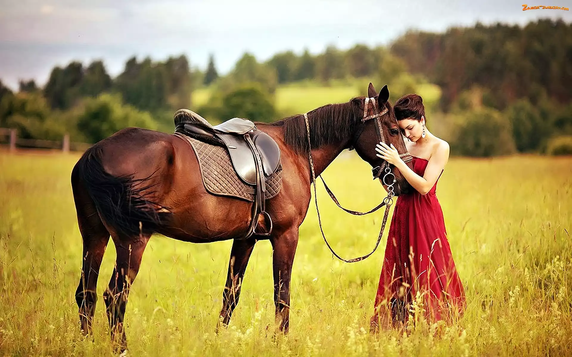 Zdjęcie: Kobieta, Koń, Łąka, Sukienka, Siodło, Czerwona