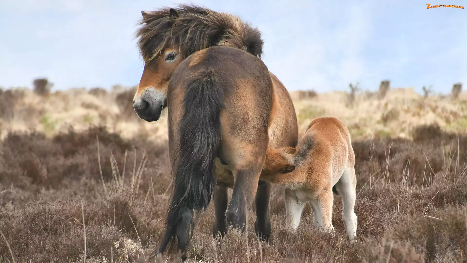 Zdjęcie: Kobyła, Źrebak, Konie, Dwa, Kuce Exmoor