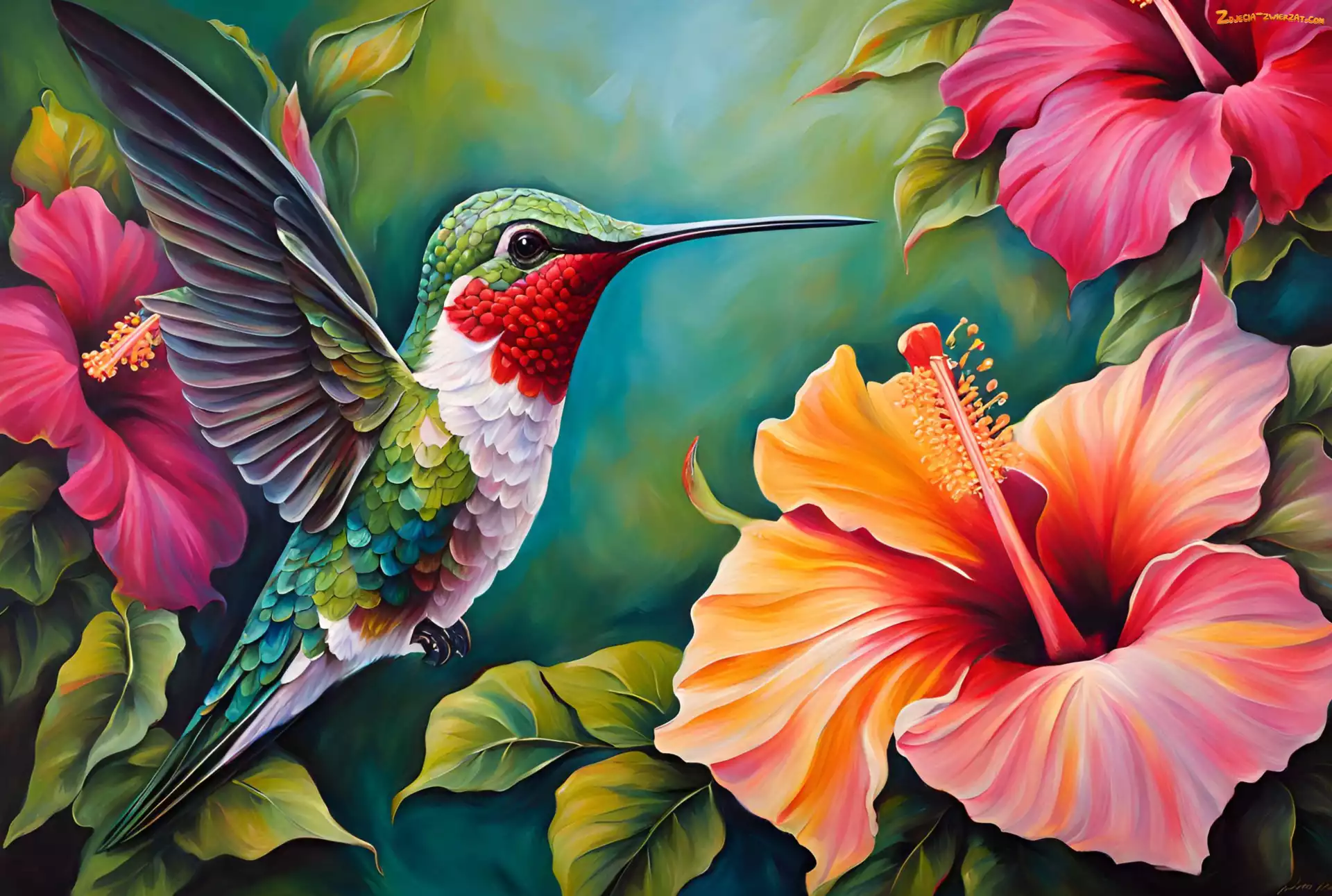 Zdjęcie: Kwiaty, Ptak, Koliber, Kolorowe, Grafika, Hibiskus, Liście