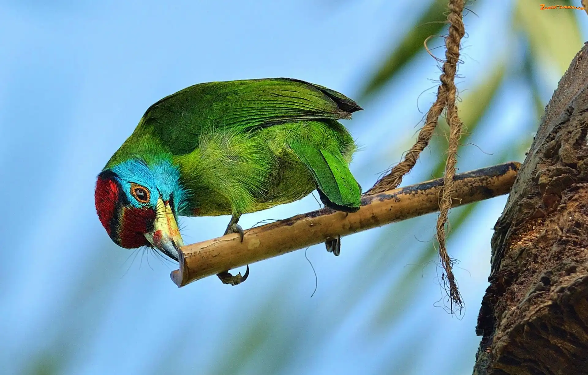 Zdjęcie: Ptak, Gałązki, Zielony, Pstrogłów niebieskolicy