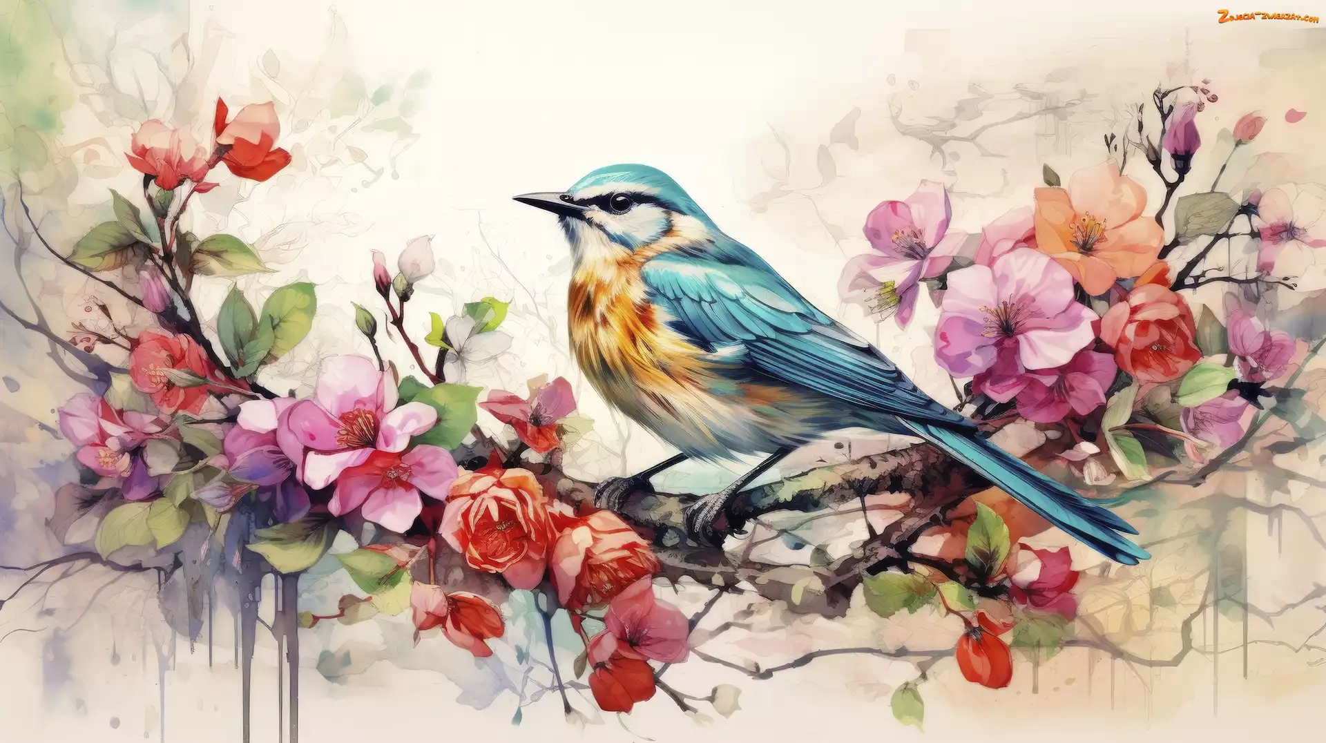 Zdjęcie: Kolorowe, Ptak, Grafika, Kolorowy, Gałązka, Kwiaty