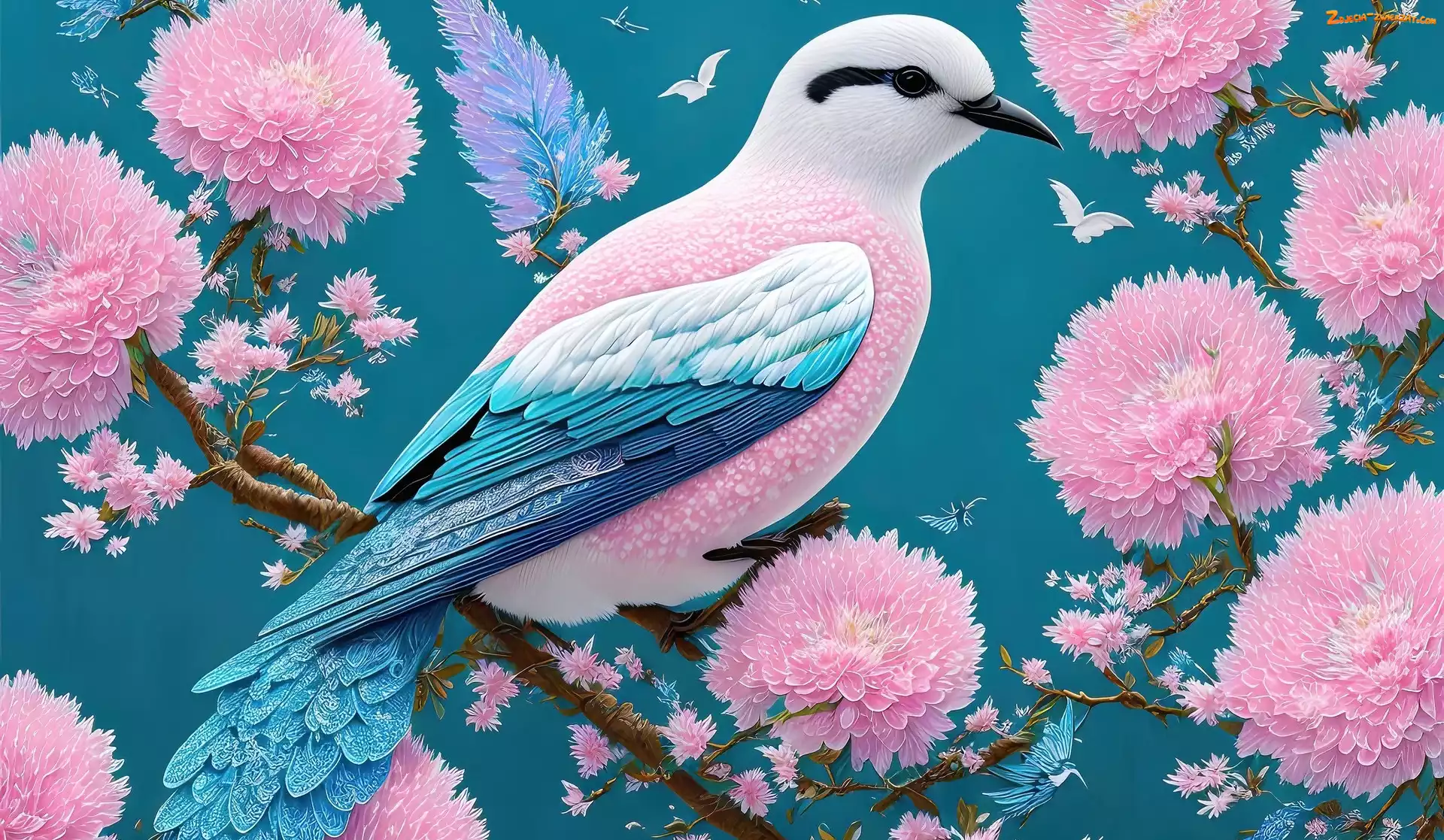 Zdjęcie: Grafika, Gałązki, Ptak, Kolorowy, Różowe, Kwiaty