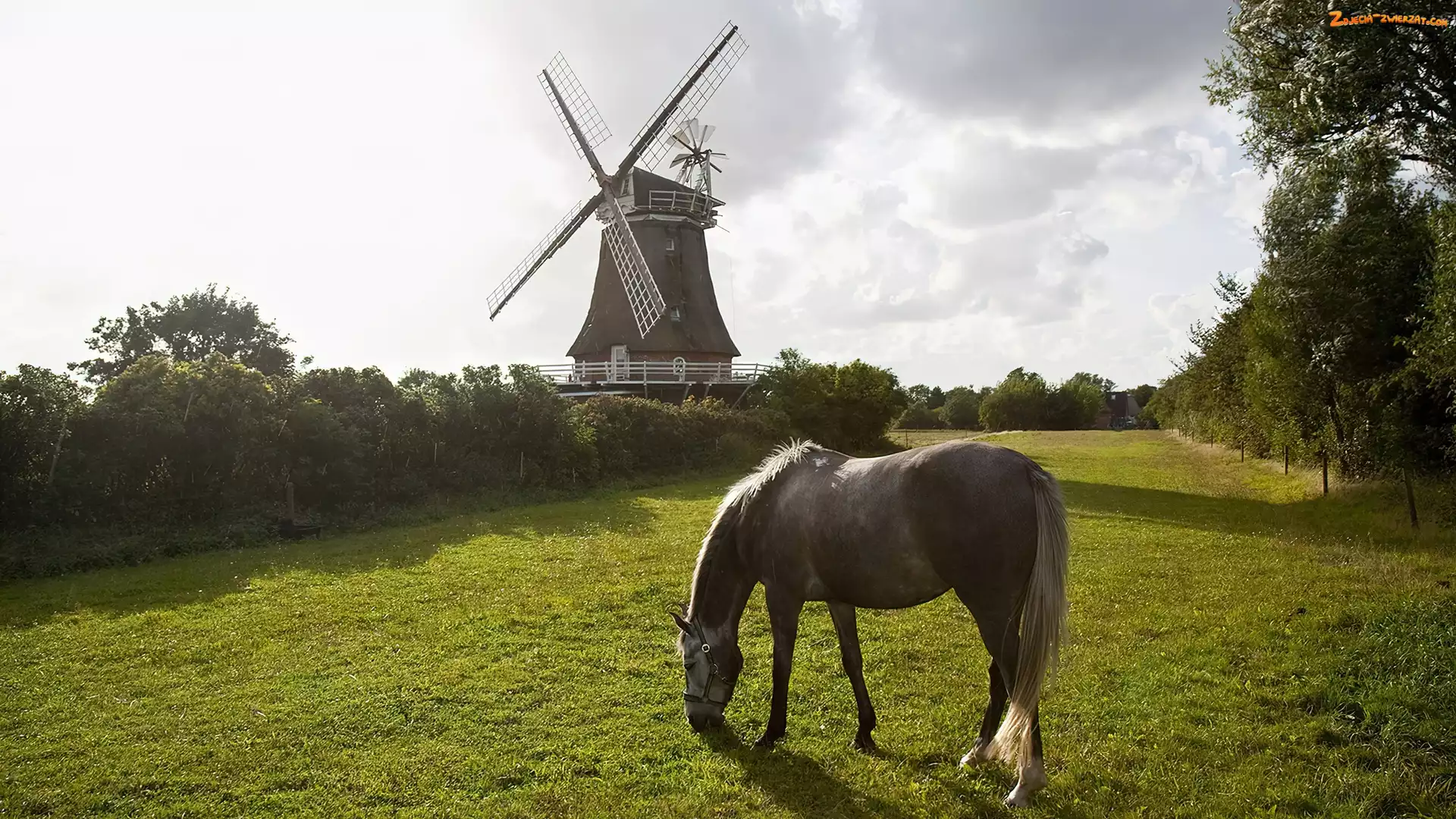 Koń, Wiatrak, Łąka, Drzewa