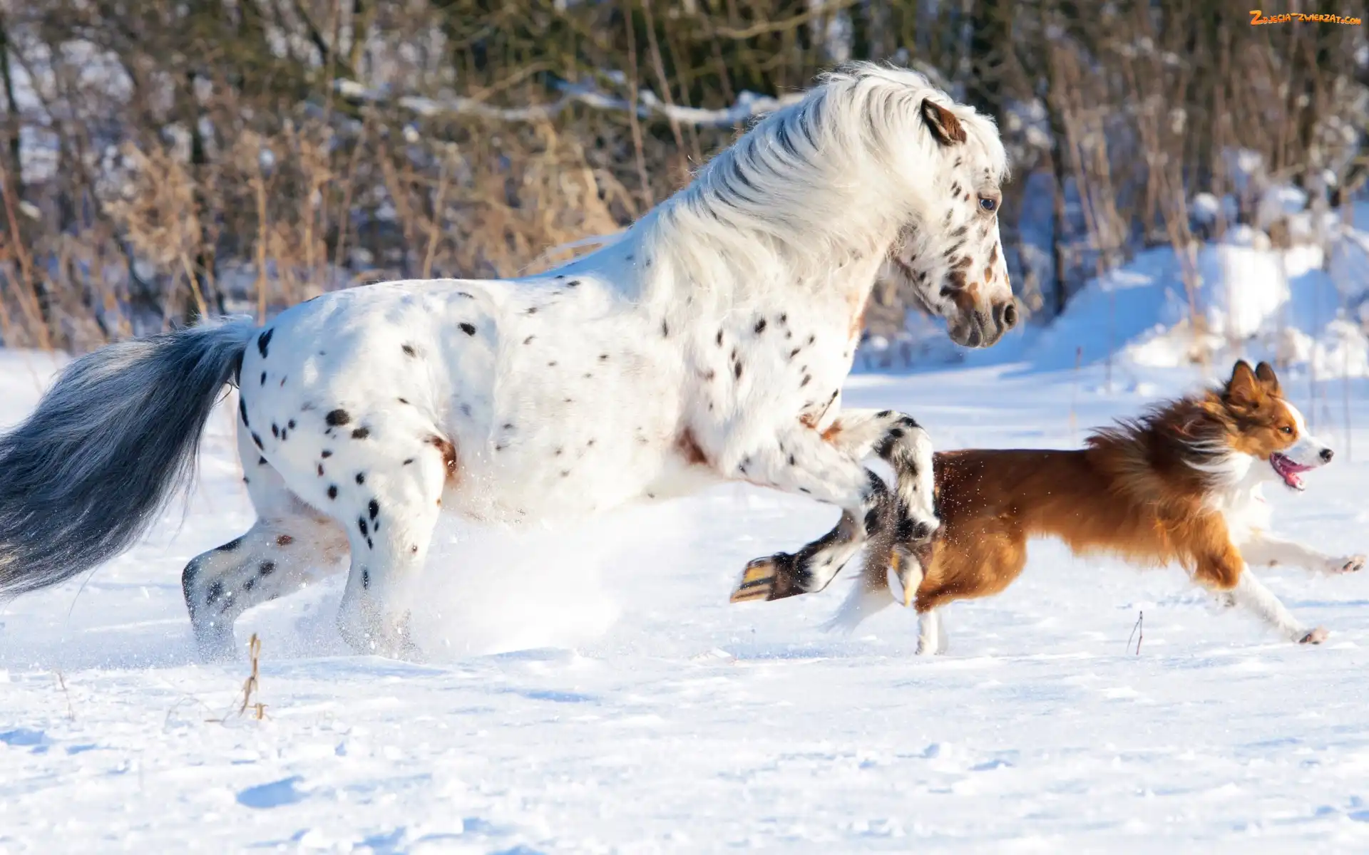 Zdjęcie: Koń Appaloosa, Śnieg, Biegnący, Border collie
