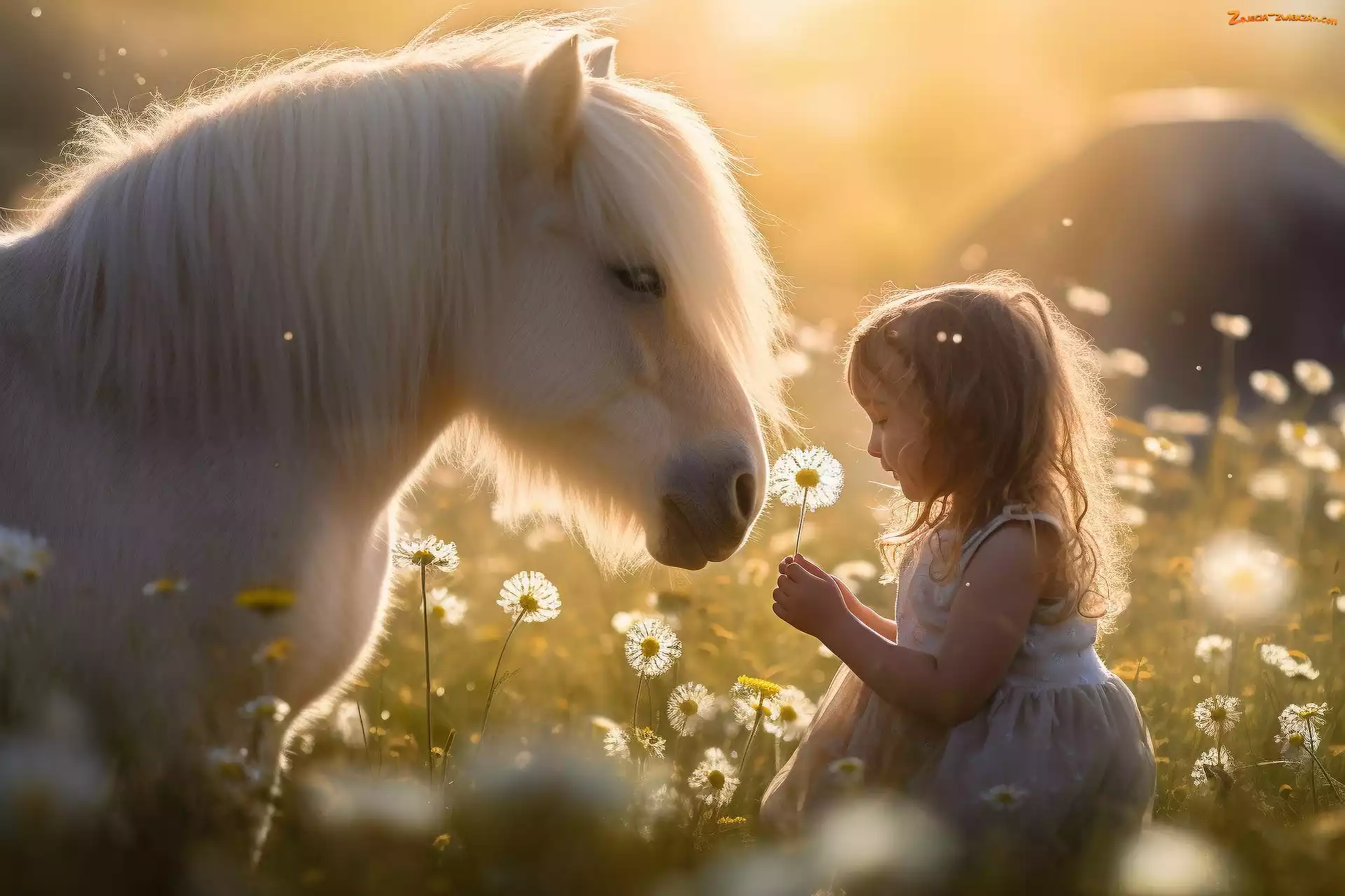 Kucyk, Koń, Dmuchawce, Łąka, Dziewczynka