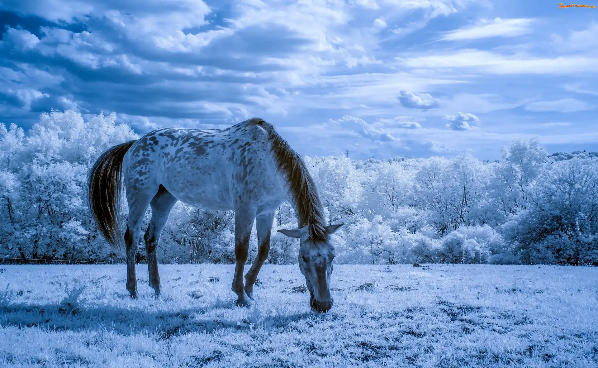 Zdjęcie: Łąka, Drzewa, Koń, Białe