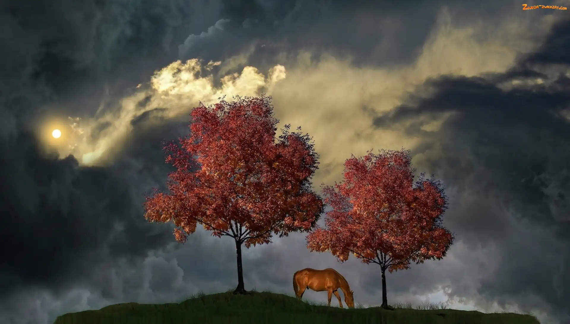Koń, Chmury, Drzewa, Niebo