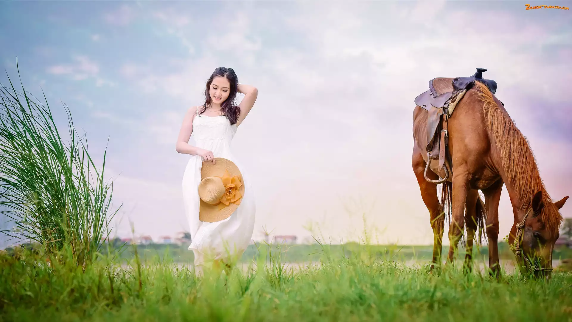 Zdjęcie: Koń, Łąka, Azjatka, Kobieta, Kapelusz