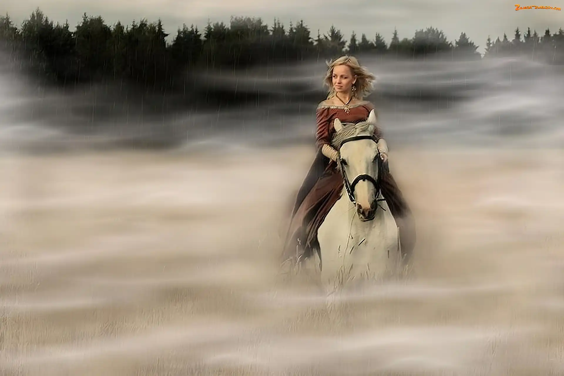 Zdjęcie: Koń, Las, Kobieta, Mgła