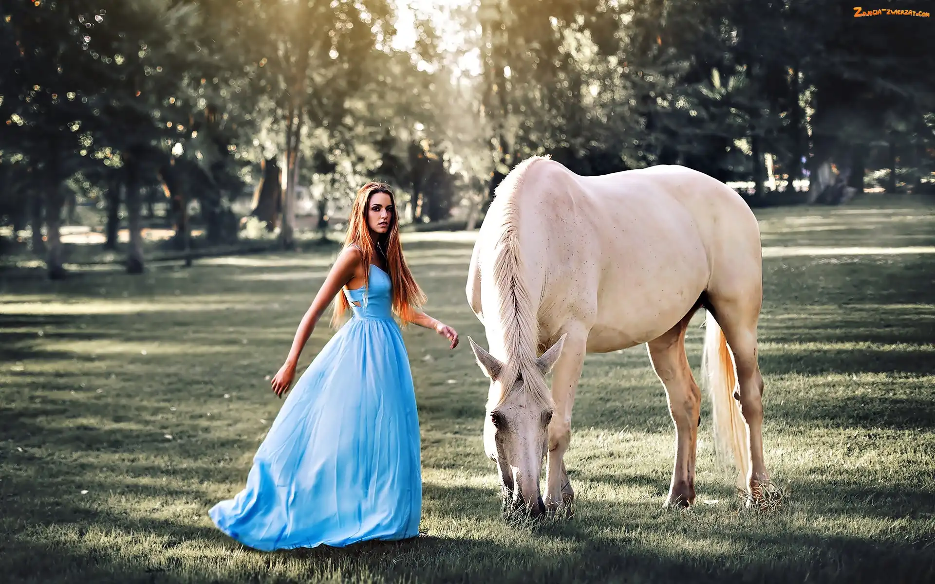 Zdjęcie: Koń, Biały, Niebieska, Kobieta, Sukienka
