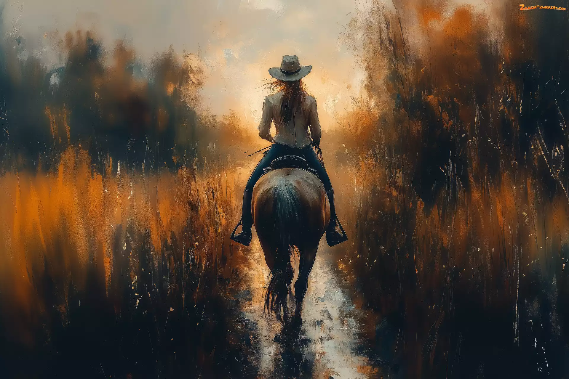 Zdjęcie: Grafika, Jesień, Kobieta, Koń, Las, Trawa