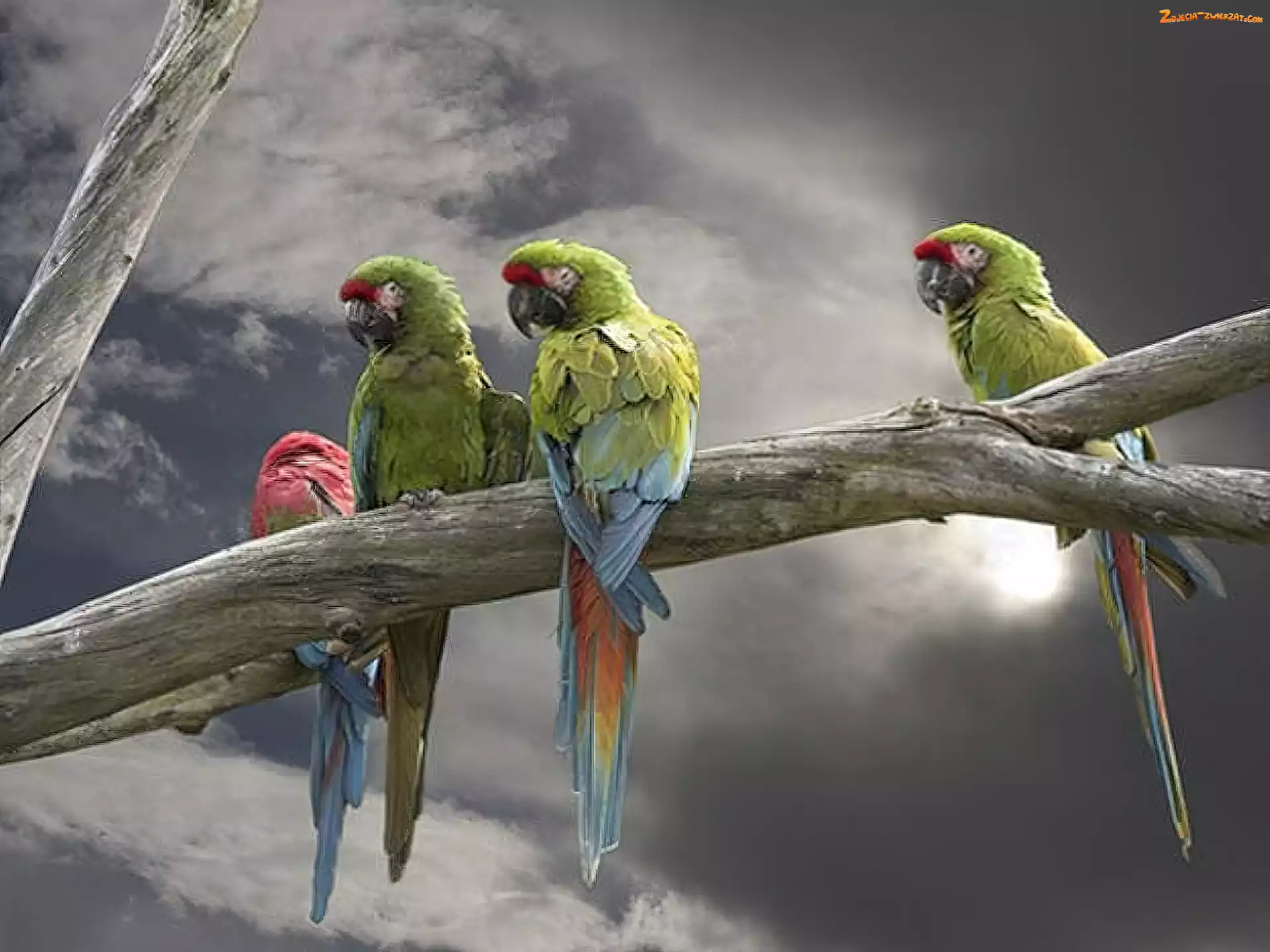 Zdjęcie: Papugi, Konar, Chmury, Drzewa