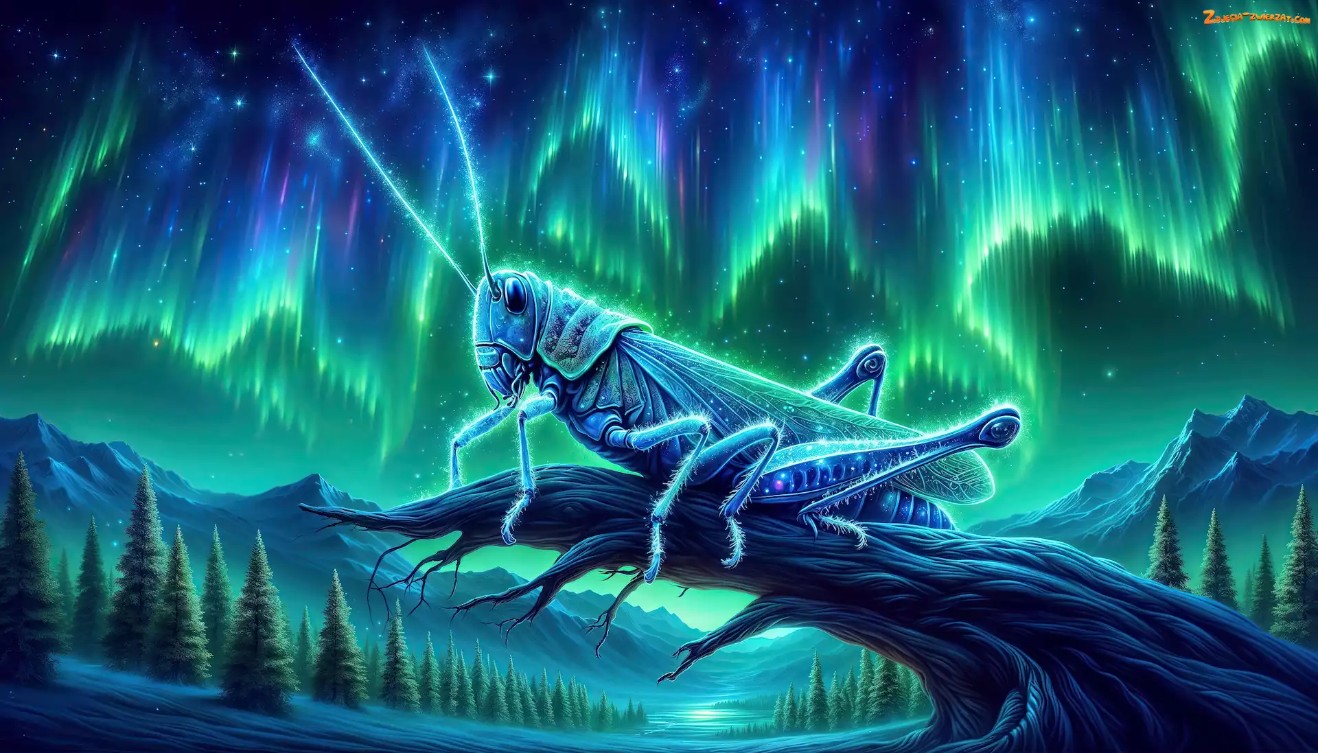 Zdjęcie: Konar, Zorza polarna, Grafika AI, Konik polny, Góry, Drzewa