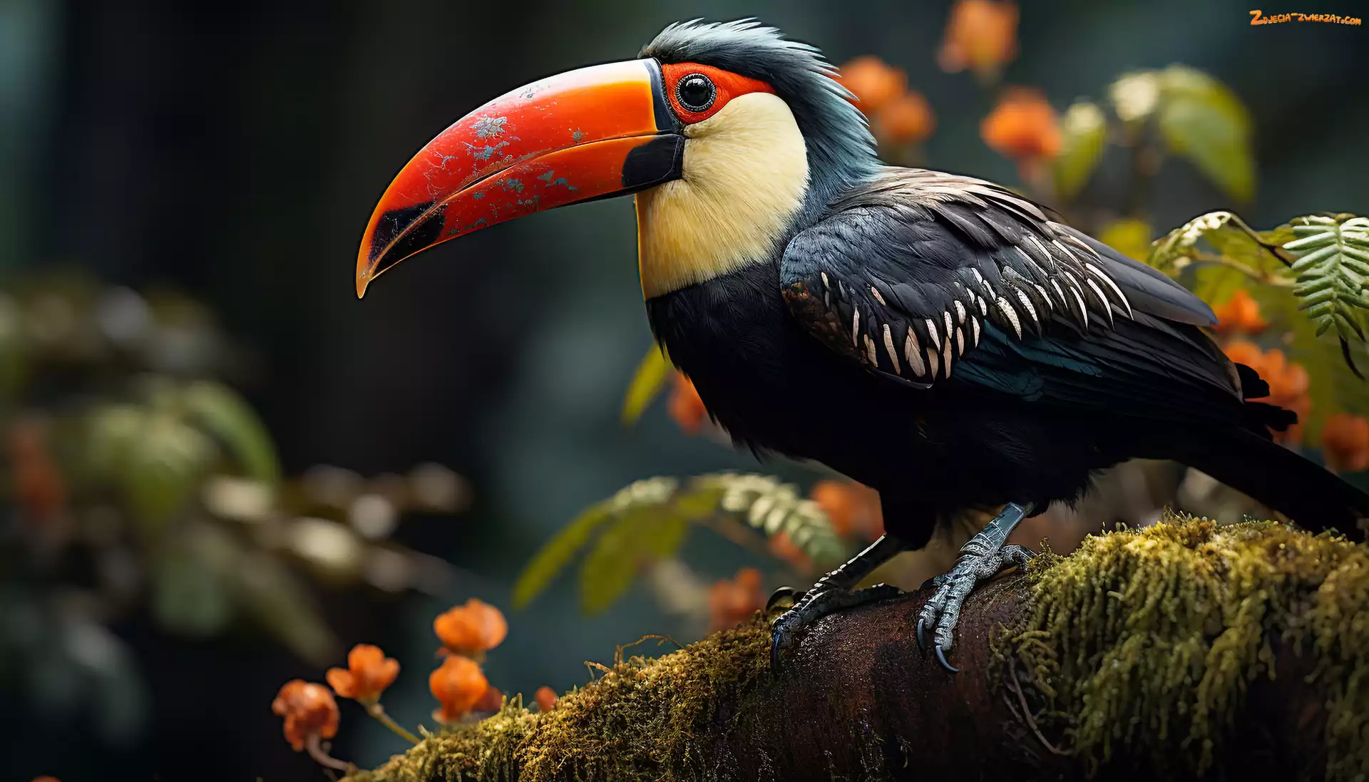 Zdjęcie: Ptak, Tukan, Kwiaty, Konar