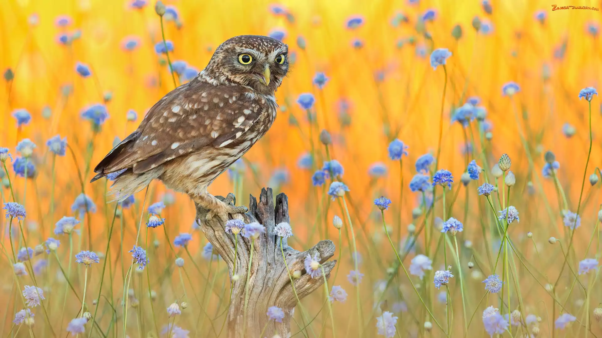 Zdjęcie: Sowa, Pójdźka, Kwiaty, Konar