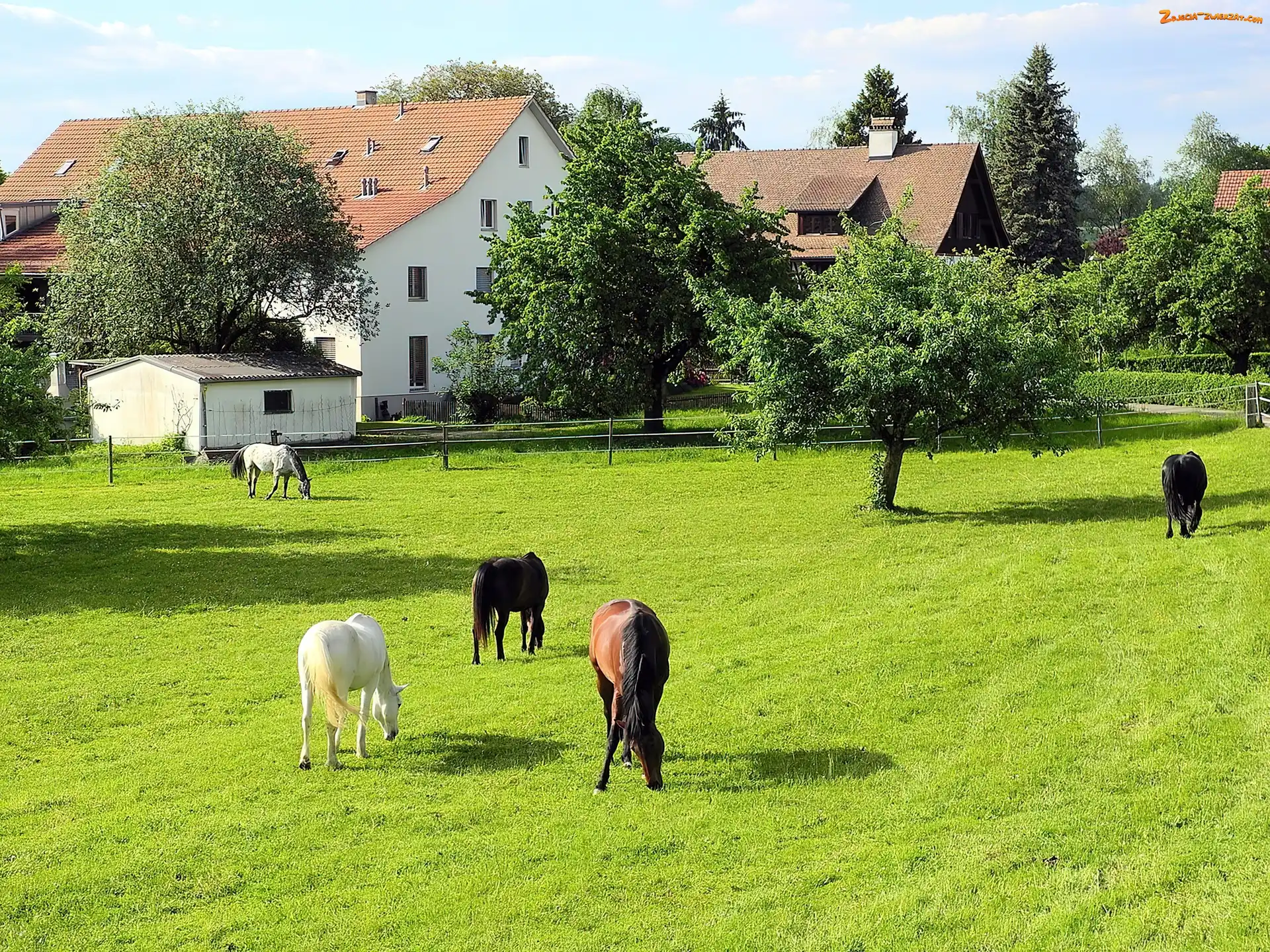 Zdjęcie: Łąka, Drzewa, Konie, Domy
