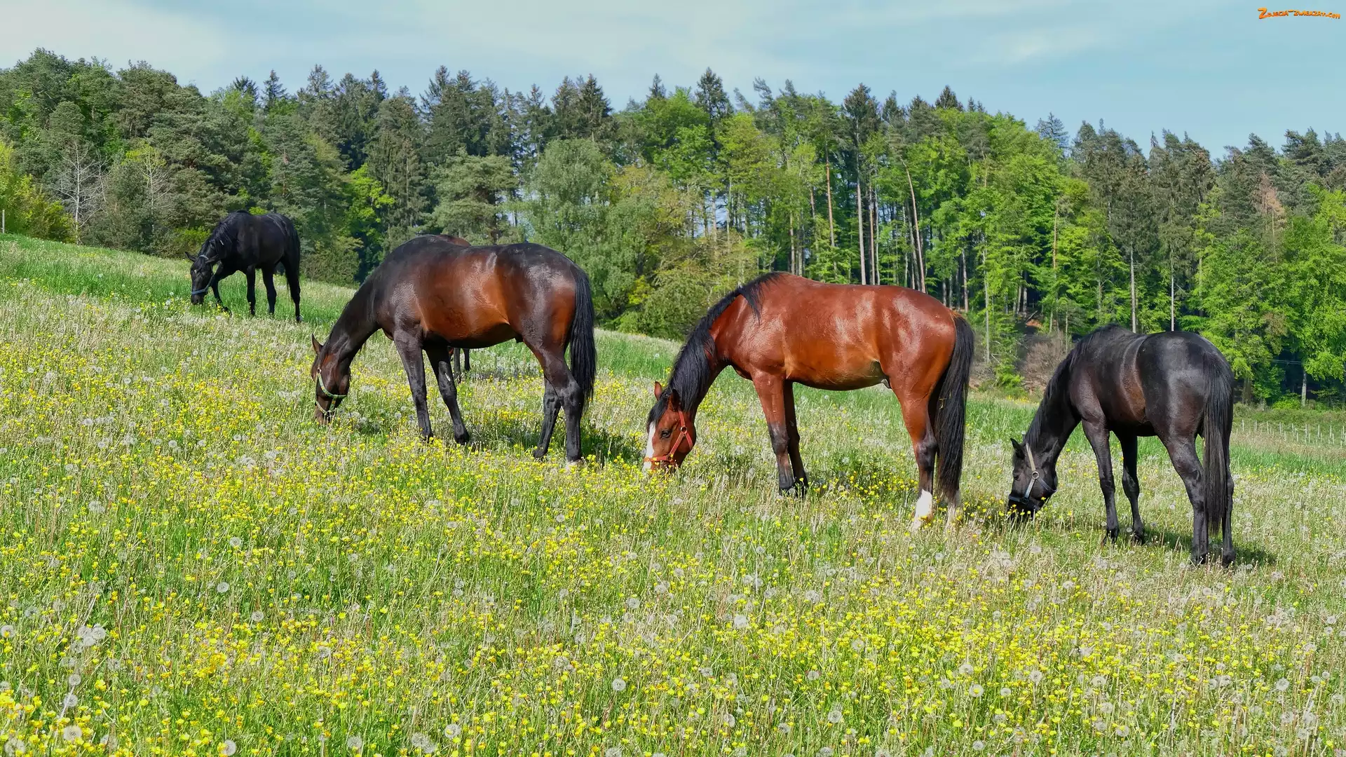 Zdjęcie: Łąka, Drzewa, Konie, Las