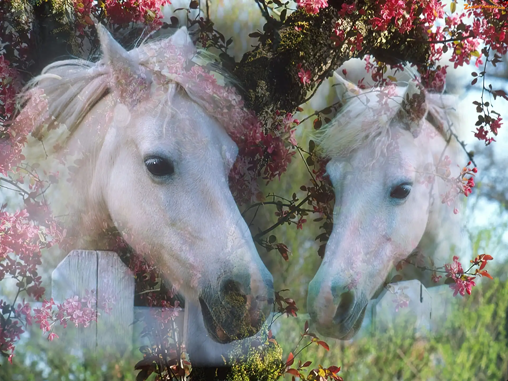 Zdjęcie: Konie, Drzewa, Dwa, Kwitnące